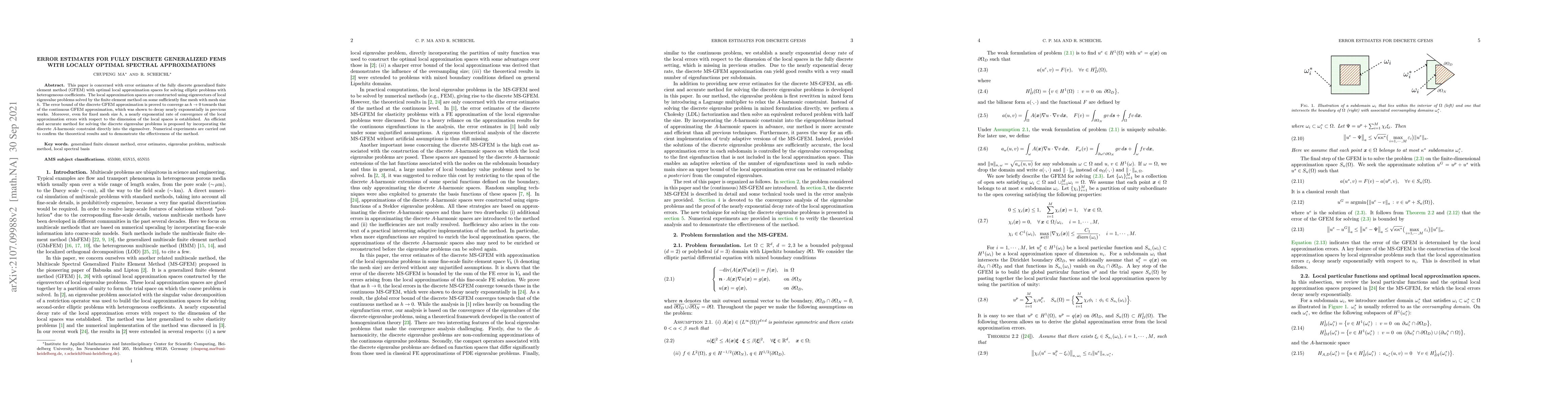 This paper is concerned with error estimates of the fully discrete generalized finite element method (GFEM) with optimal local approximation spaces for solving elliptic problems with heterogeneous coefficients. The local approximation spaces are constructed using eigenvectors of local eigenvalue problems solved by the finite element method on some sufficiently fine mesh with mesh size $h$. The error bound of the discrete GFEM approximation is proved to converge as $h\rightarrow 0$ towards that of the continuous GFEM approximation, which was shown to decay nearly exponentially in previous works. Moreover, even for fixed mesh size $h$, a nearly exponential rate of convergence of the local approximation errors with respect to the dimension of the local spaces is established. An efficient and accurate method for solving the discrete eigenvalue problems is proposed by incorporating the discrete $A$-harmonic constraint directly into the eigensolver. Numerical experiments are carried out to confirm the theoretical results and to demonstrate the effectiveness of the method.