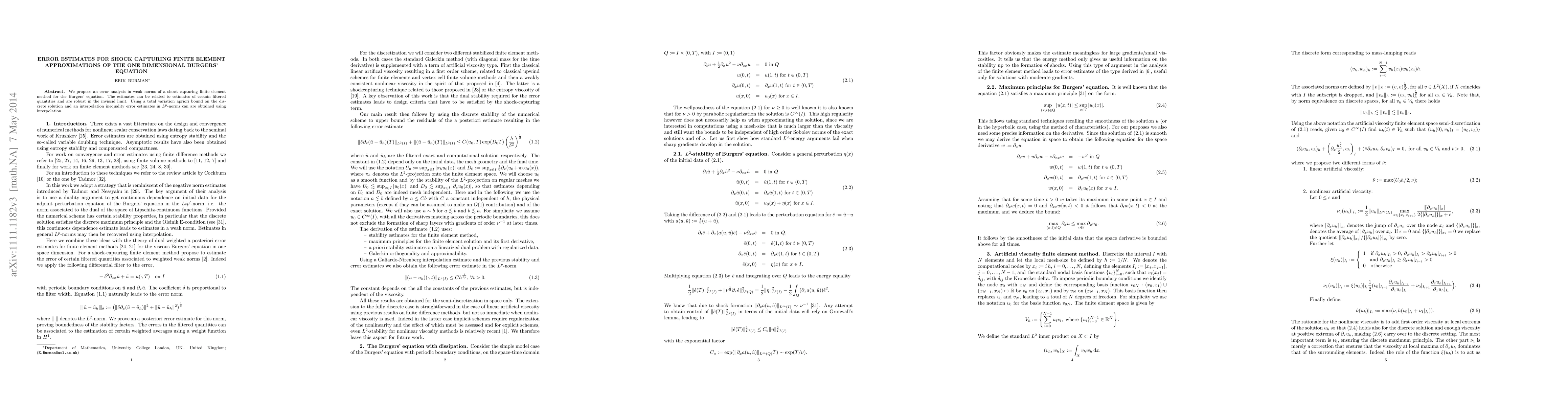 Summary: This paper provides error estimates for a shock capturing finite element method applied to the one-dimensional Burgers' equation, demonstrating robustness in the inviscid limit. The analysis utilizes total variation bounds and interpolation inequalities to derive $L^p$-norm error estimates.