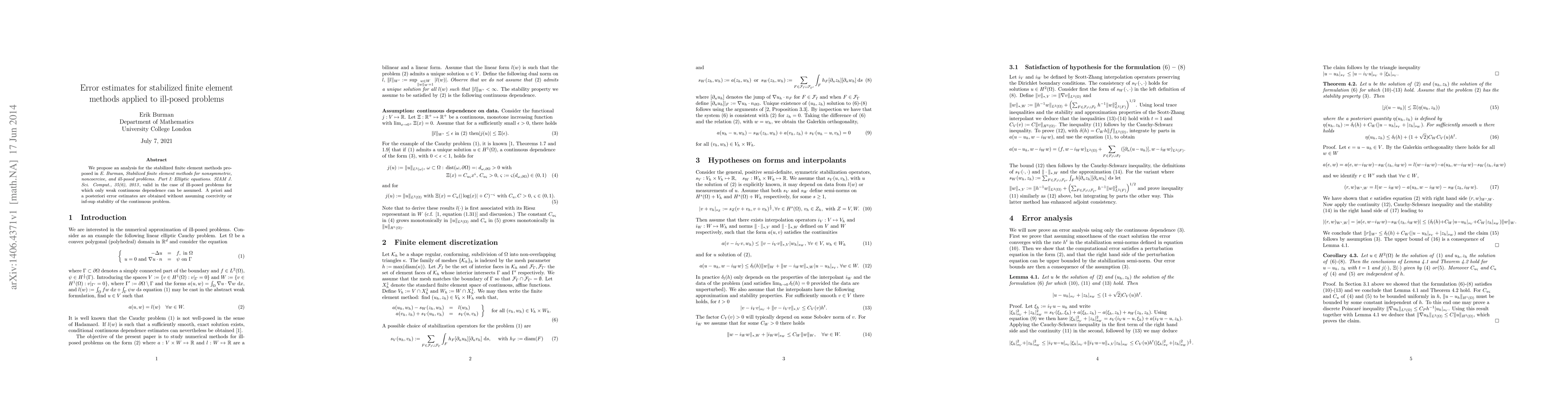 This paper provides an analysis of stabilized finite element methods for solving ill-posed problems, deriving a priori and a posteriori error estimates without requiring coercivity or inf-sup stability. A numerical example demonstrates the effectiveness of the proposed approach.
