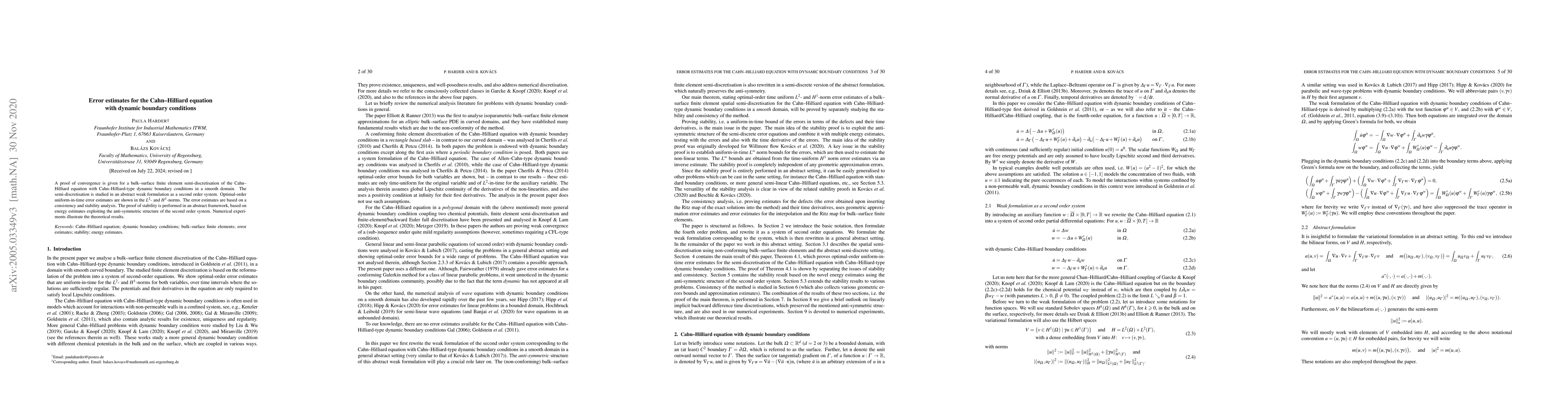 This paper proves convergence for a finite element semi-discretisation of the Cahn-Hilliard equation with dynamic boundary conditions, demonstrating optimal-order uniform-in-time error estimates in $L^2$ and $H^1$ norms through consistency and stability analysis. Numerical experiments validate the theoretical results.