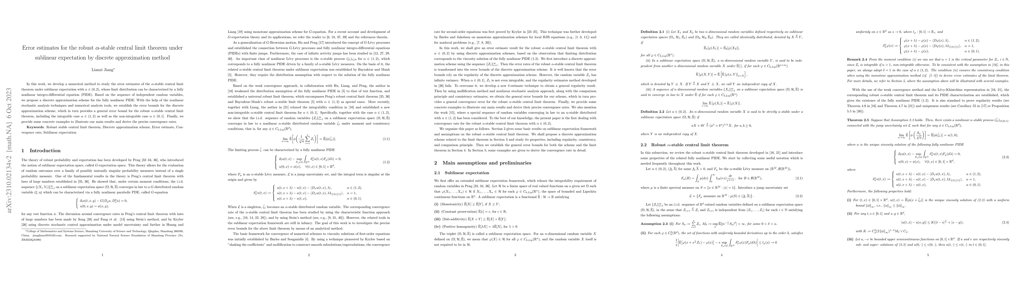 In this work, we develop a numerical method to study the error estimates of the $\alpha$-stable central limit theorem under sublinear expectation with $\alpha \in(0,2)$, whose limit distribution can be characterized by a fully nonlinear integro-differential equation (PIDE). Based on the sequence of independent random variables, we propose a discrete approximation scheme for the fully nonlinear PIDE. With the help of the nonlinear stochastic analysis techniques and numerical analysis tools, we establish the error bounds for the discrete approximation scheme, which in turn provides a general error bound for the robust $\alpha$-stable central limit theorem, including the integrable case $\alpha \in(1,2)$ as well as the non-integrable case $\alpha \in(0,1]$. Finally, we provide some concrete examples to illustrate our main results and derive the precise convergence rates.