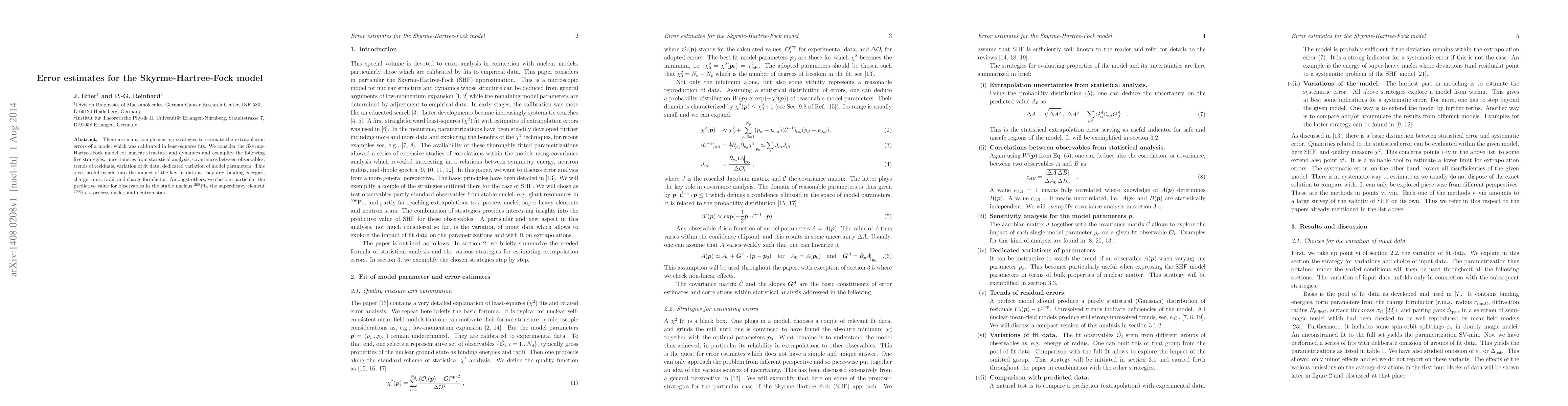 There are many complementing strategies to estimate the extrapolation errors of a model which was calibrated in least-squares fits. We consider the Skyrme-Hartree-Fock model for nuclear structure and dynamics and exemplify the following five strategies: uncertainties from statistical analysis, covariances between observables, trends of residuals, variation of fit data, dedicated variation of model parameters. This gives useful insight into the impact of the key fit data as they are: binding energies, charge r.m.s. radii, and charge formfactor. Amongst others, we check in particular the predictive value for observables in the stable nucleus $^{208}$Pb, the super-heavy element $^{266}$Hs, $r$-process nuclei, and neutron stars.