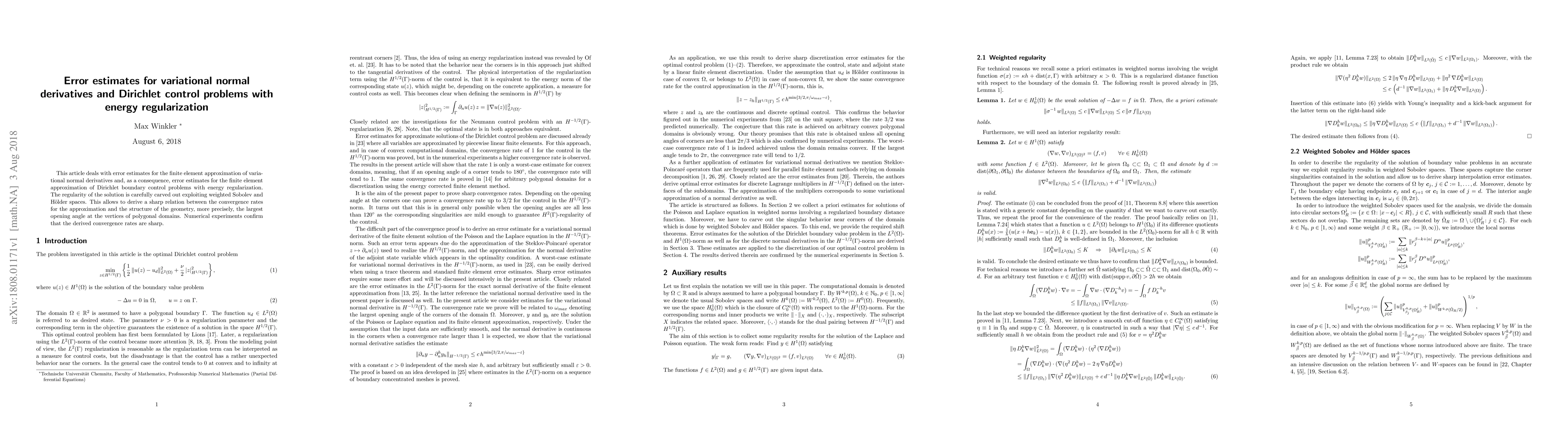 This paper provides error estimates for finite element approximations of variational normal derivatives and Dirichlet boundary control problems with energy regularization, leveraging weighted Sobolev and H\"older spaces to derive convergence rates influenced by the geometry's largest vertex angle. Numerical experiments validate the sharpness of these derived rates.
