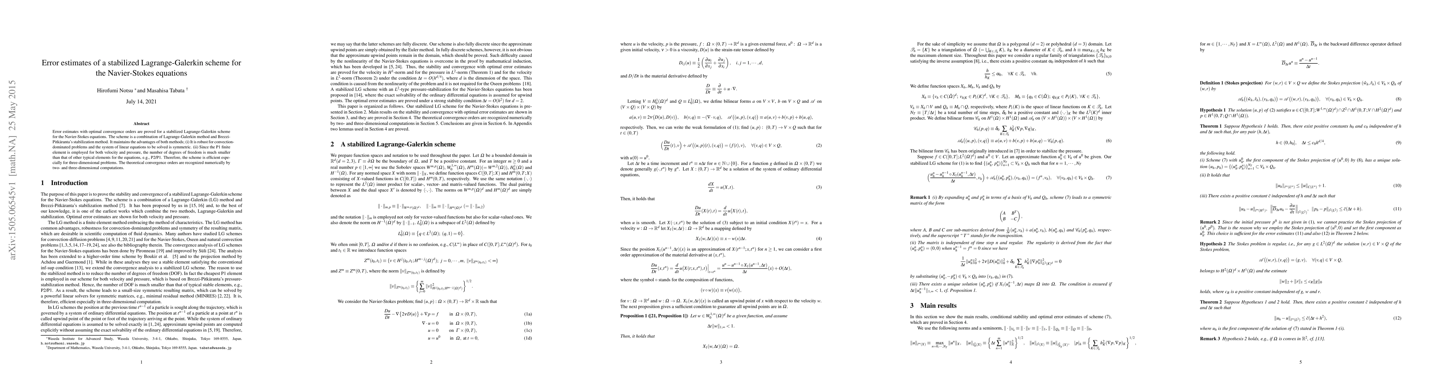 This paper presents error estimates for a stabilized Lagrange-Galerkin scheme combining the Lagrange-Galerkin method with Brezzi-Pitkaranta stabilization for the Navier-Stokes equations, demonstrating optimal convergence and efficiency, especially for three-dimensional problems. Numerical results confirm the theoretical convergence orders.