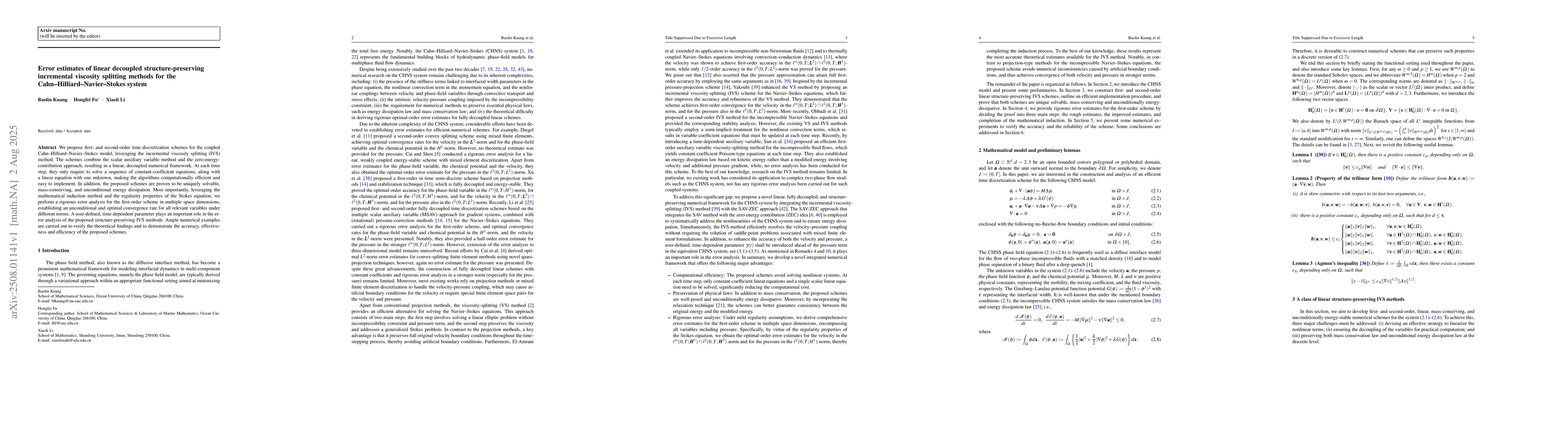 We propose first- and second-order time discretization schemes for the coupled Cahn--Hilliard--Navier--Stokes model, leveraging the incremental viscosity splitting (IVS) method. The schemes combine the scalar auxiliary variable method and the zero-energy-contribution approach, resulting in a linear, decoupled numerical framework. At each time step, they only require to solve a sequence of constant-coefficient equations, along with a linear equation with one unknown, making the algorithms computationally efficient and easy to implement. In addition, the proposed schemes are proven to be uniquely solvable, mass-conserving, and unconditional energy dissipation. Most importantly, leveraging the mathematical induction method and the regularity properties of the Stokes equation, we perform a rigorous error analysis for the first-order scheme in multiple space dimensions, establishing an unconditional and optimal convergence rate for all relevant variables under different norms. A user-defined, time-dependent parameter plays an important role in the error analysis of the proposed structure-preserving IVS methods. Ample numerical examples are carried out to verify the theoretical findings and to demonstrate the accuracy, effectiveness and efficiency of the proposed schemes.