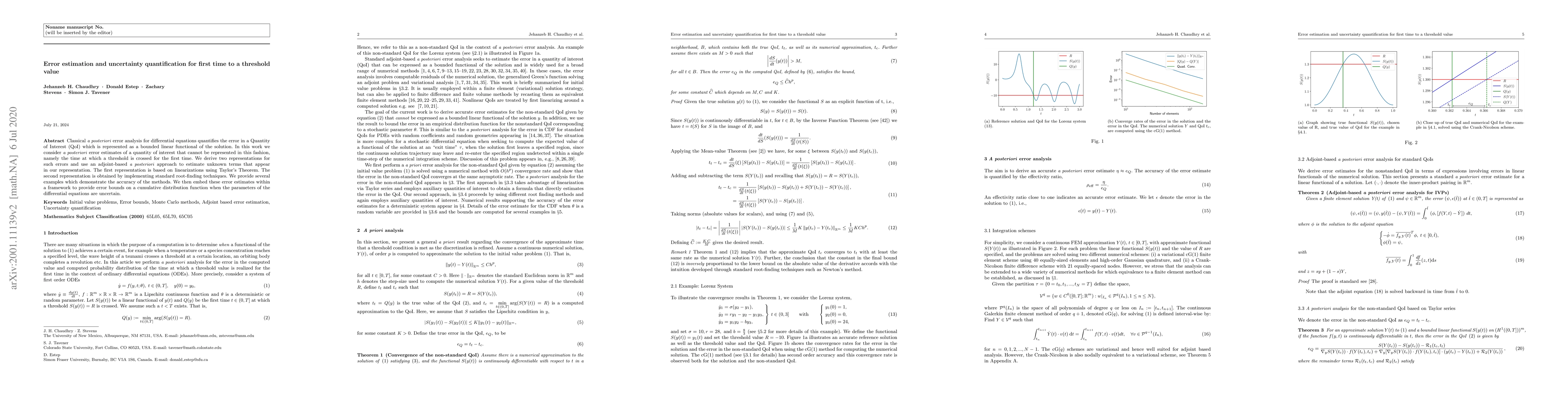 This paper develops a posteriori error estimation techniques for quantifying uncertainty in the first time a threshold is crossed in differential equations. It provides two representations for such errors and uses an adjoint-based approach to estimate unknown terms, demonstrating accuracy through examples and embedding the estimates within a framework for handling parameter uncertainties.