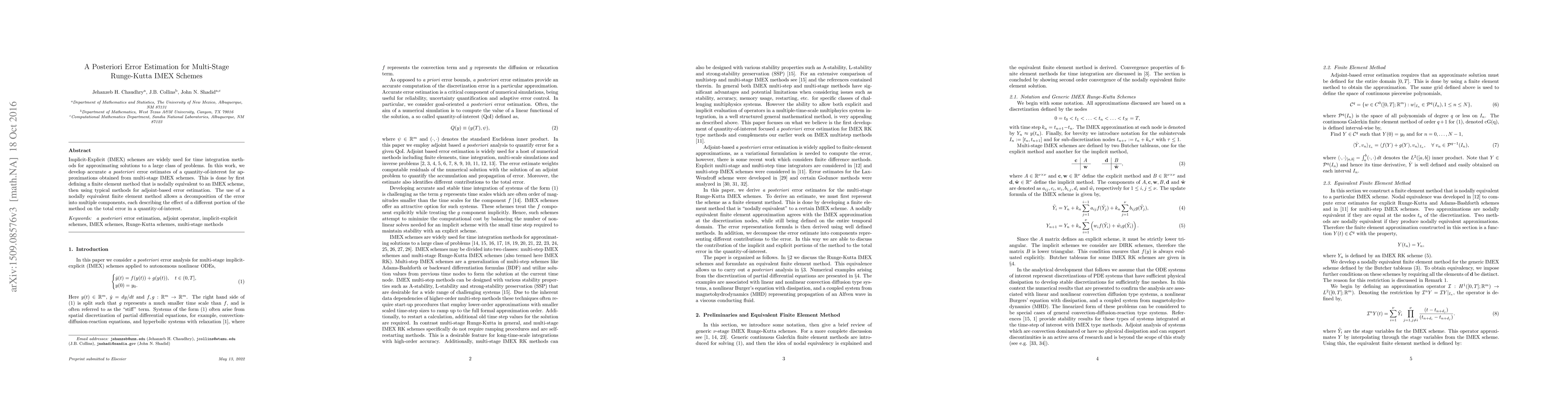 Implicit-Explicit (IMEX) schemes are widely used for time integration methods for approximating solutions to a large class of problems. In this work, we develop accurate a posteriori error estimates of a quantity of interest for approximations obtained from multi-stage IMEX schemes. This is done by first defining a finite element method that is nodally equivalent to an IMEX scheme, then using typical methods for adjoint-based error estimation. The use of a nodally equivalent finite element method allows a decomposition of the error into multiple components, each describing the effect of a different portion of the method on the total error in a quantity of interest.
