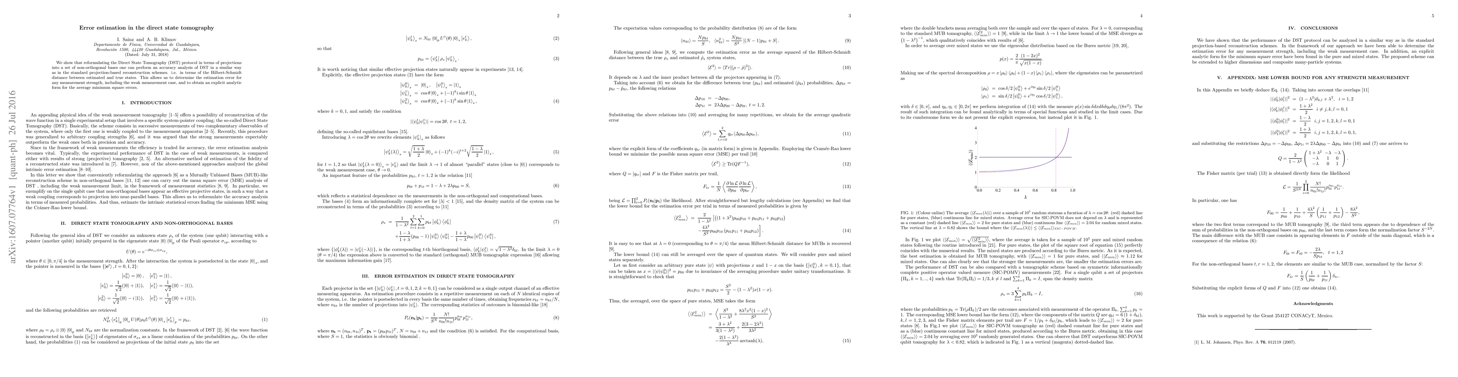 This paper reformulates Direct State Tomography (DST) using projections into non-orthogonal bases, enabling an accuracy analysis similar to standard reconstruction schemes. It provides an explicit analytic form for the average minimum square errors, determining the estimation error for various measurement strengths.