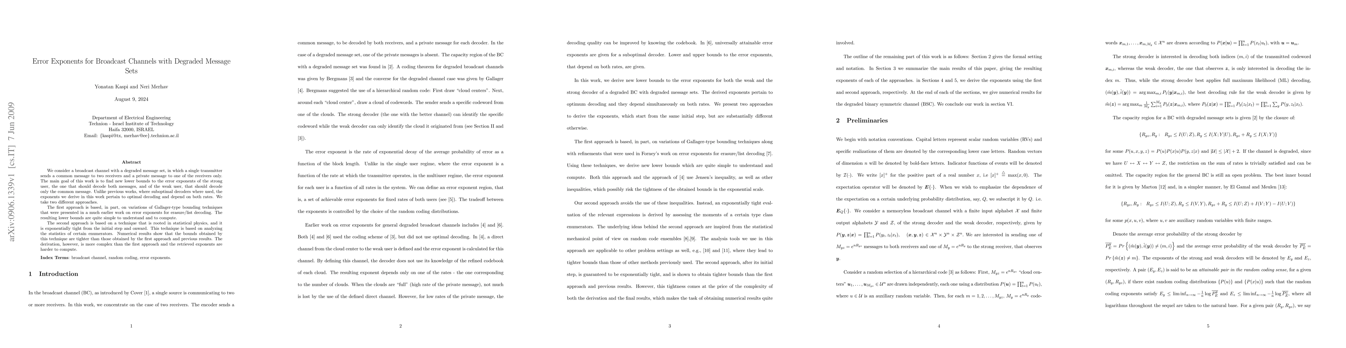 This paper investigates error exponents for a broadcast channel with degraded message sets, focusing on optimal decoding. It presents two approaches: one based on Gallager-type bounding techniques and another rooted in statistical physics, showing that the latter provides tighter bounds though with more complex derivation and computation.