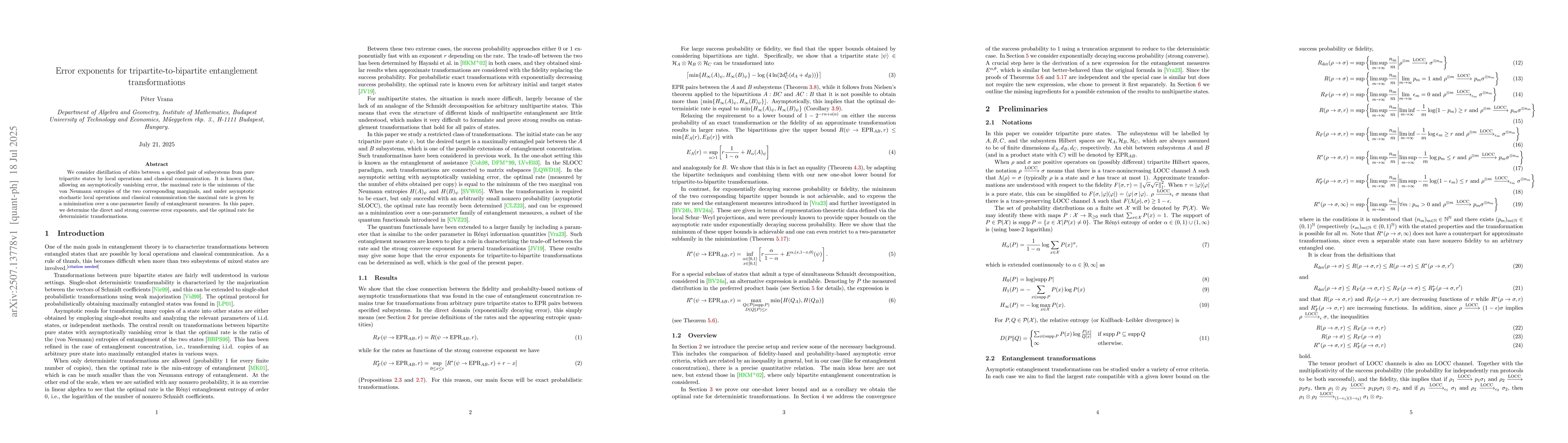 This research derives error exponents for converting tripartite entanglement into bipartite entanglement via local operations and classical communication, determining optimal rates for both asymptotic and deterministic transformations.