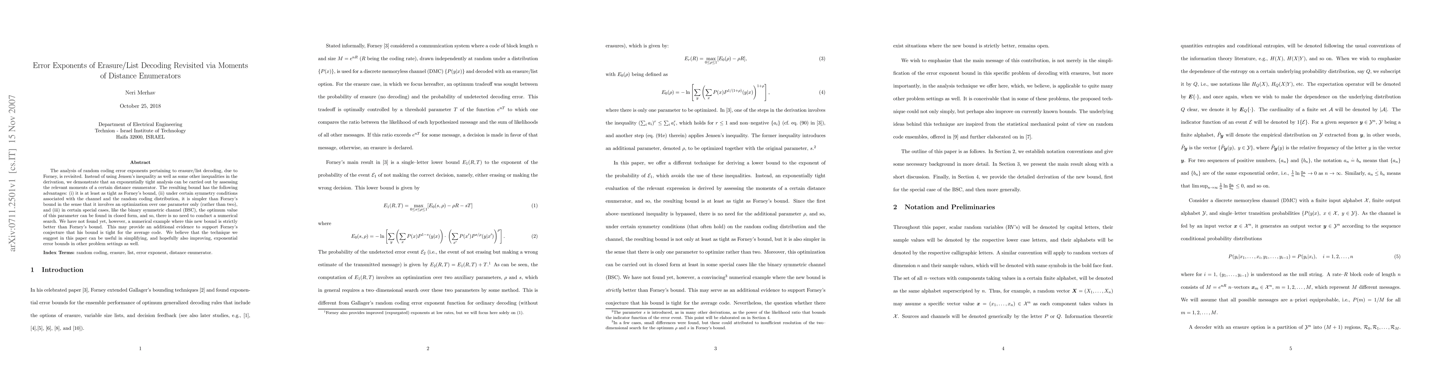 This paper revisits Forney's analysis of error exponents for erasure/list decoding, proposing a new method based on the moments of a distance enumerator instead of traditional inequalities. The new bound is at least as tight as Forney's, simpler under symmetry conditions, and can be solved in closed form for special cases like the BSC.