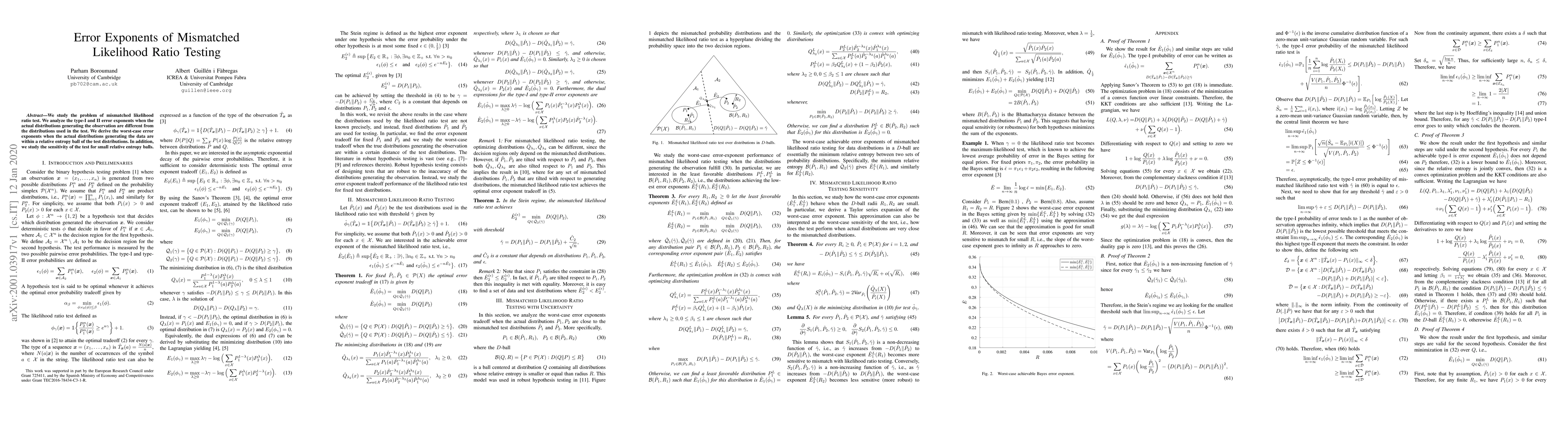 This paper studies error exponents of mismatched likelihood ratio testing, analyzing type-1 and type-2 errors when actual distributions differ from test distributions. It derives worst-case error exponents for small relative entropy balls.