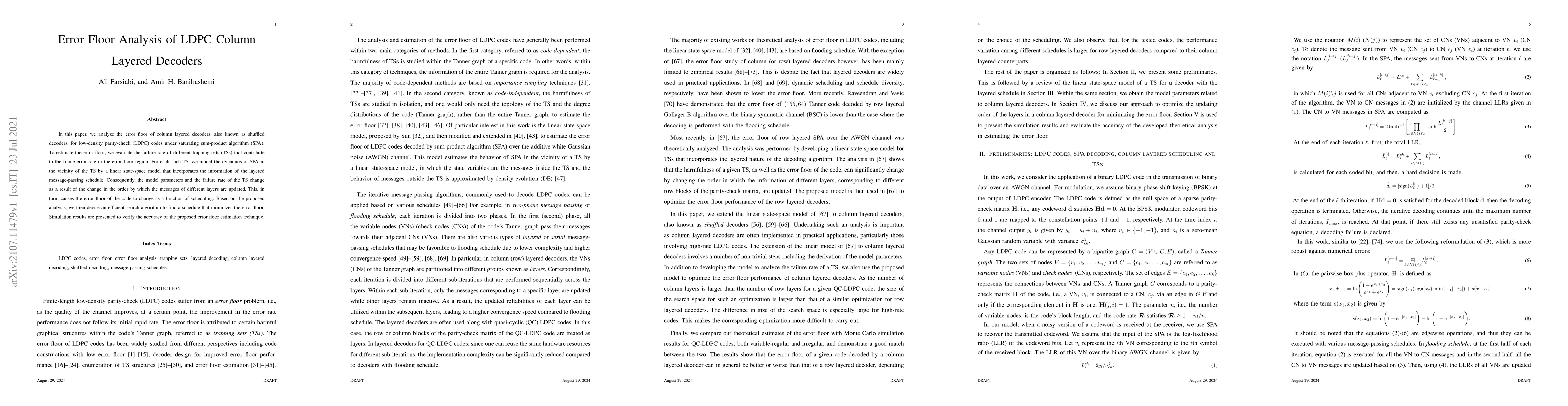 This paper analyzes the error floor of LDPC column layered decoders using the sum-product algorithm, identifying trapping sets contributing to the error floor. It proposes a linear state-space model to estimate the failure rate of these sets and develops a search algorithm to find a scheduling order that minimizes the error floor, validated by simulation results.