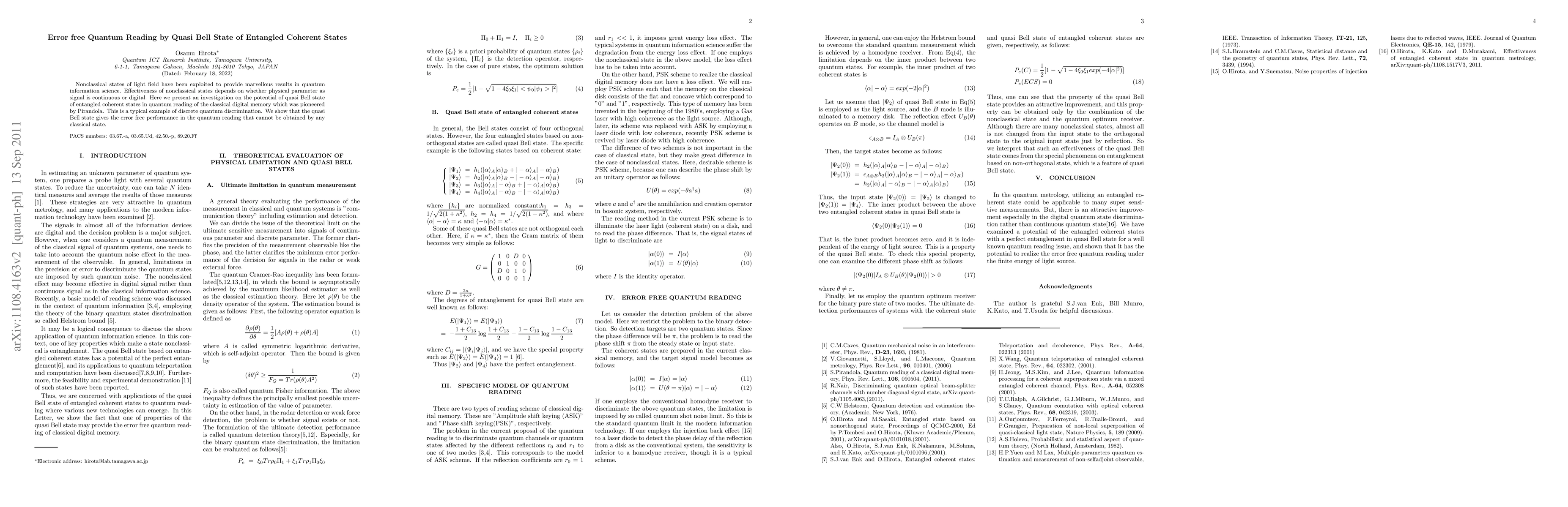 This paper investigates the potential of quasi Bell states of entangled coherent states for error-free quantum reading of classical digital memory, demonstrating superior performance over classical states in discrete quantum discrimination. The study shows that this approach achieves error-free quantum reading, a feat unattainable by classical methods.