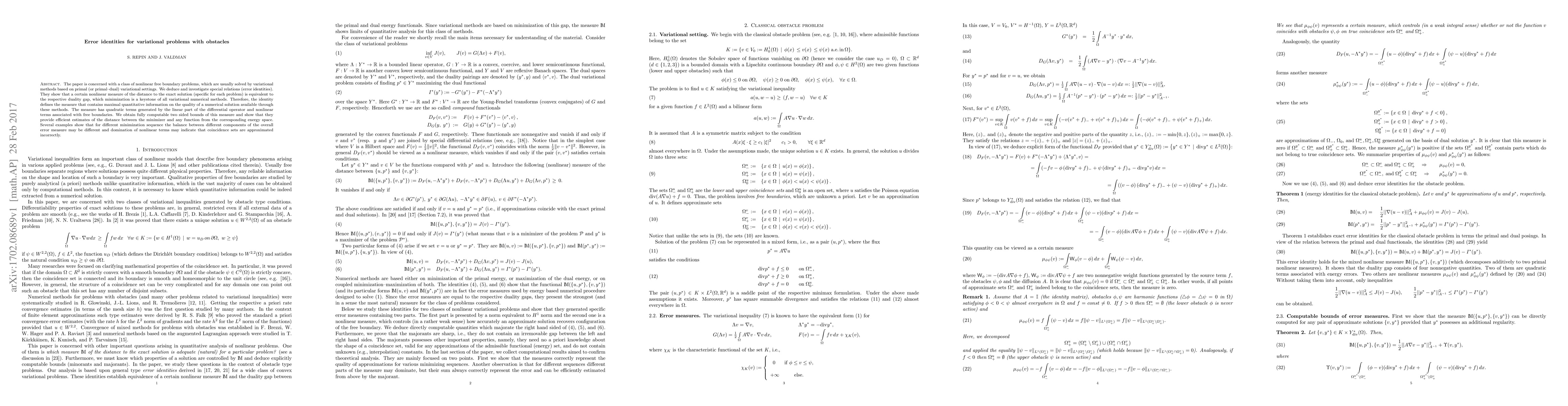 This paper develops error identities for variational problems with obstacles, showing that a nonlinear measure of distance to the exact solution is equivalent to the duality gap. It provides computable bounds for this measure, which offers insights into the quality of numerical solutions and highlights the balance between linear and nonlinear error components.