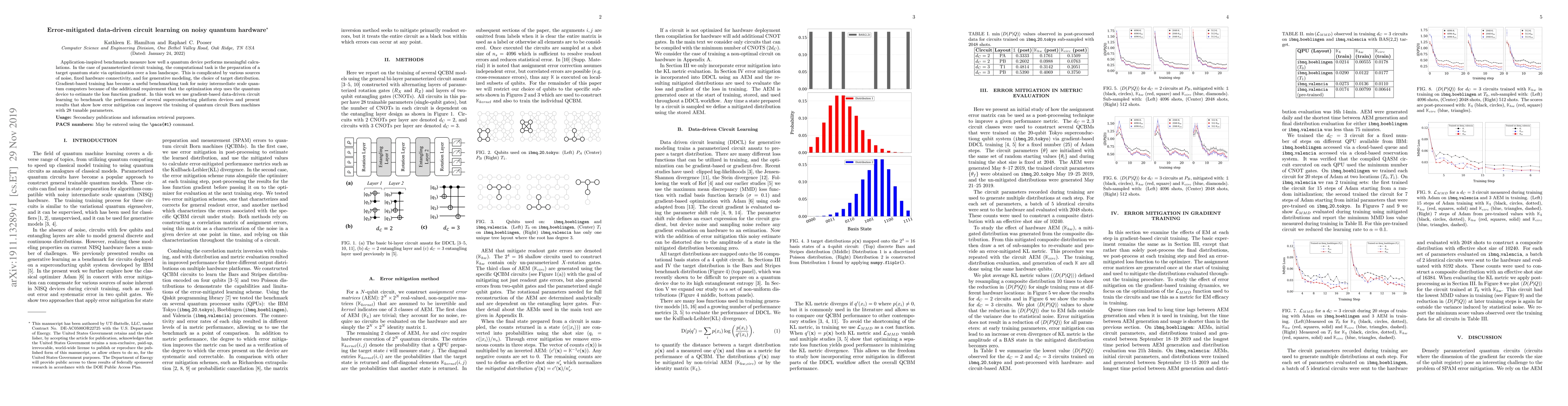 This research benchmarks the performance of superconducting quantum devices using gradient-based circuit learning, focusing on error mitigation techniques to enhance the training of quantum circuit models with 28 parameters on noisy hardware. The study demonstrates improved training outcomes through the application of error mitigation strategies.
