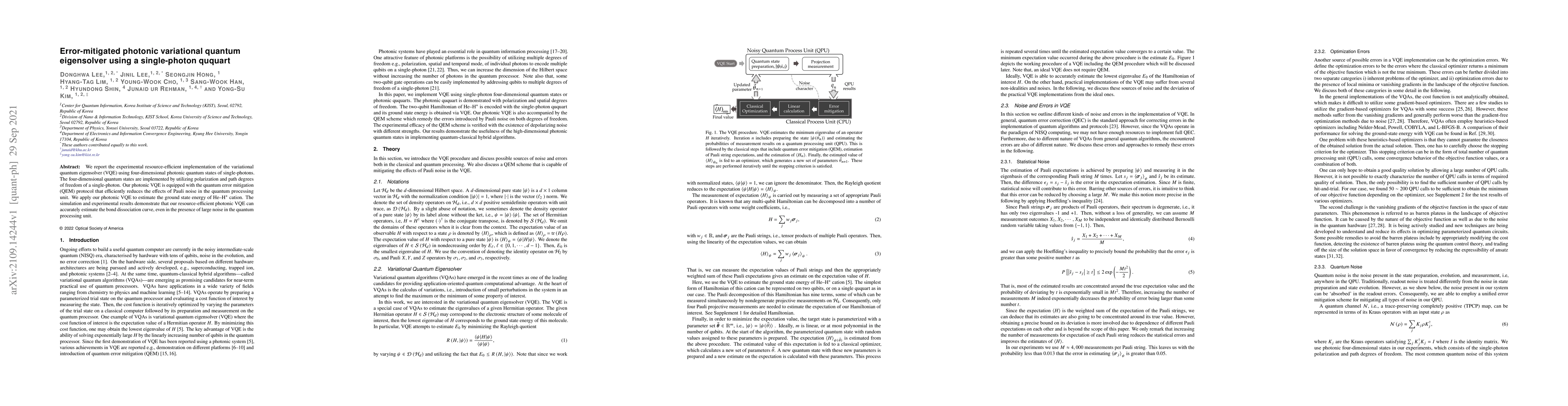 This paper presents a resource-efficient photonic implementation of the variational quantum eigensolver (VQE) using single-photon ququarts, which leverages both polarization and path degrees of freedom. The approach incorporates quantum error mitigation to reduce Pauli noise, successfully estimating the ground state energy of the He--H$^{+}$ cation and demonstrating accurate bond dissociation curve estimation despite significant quantum processing unit noise.