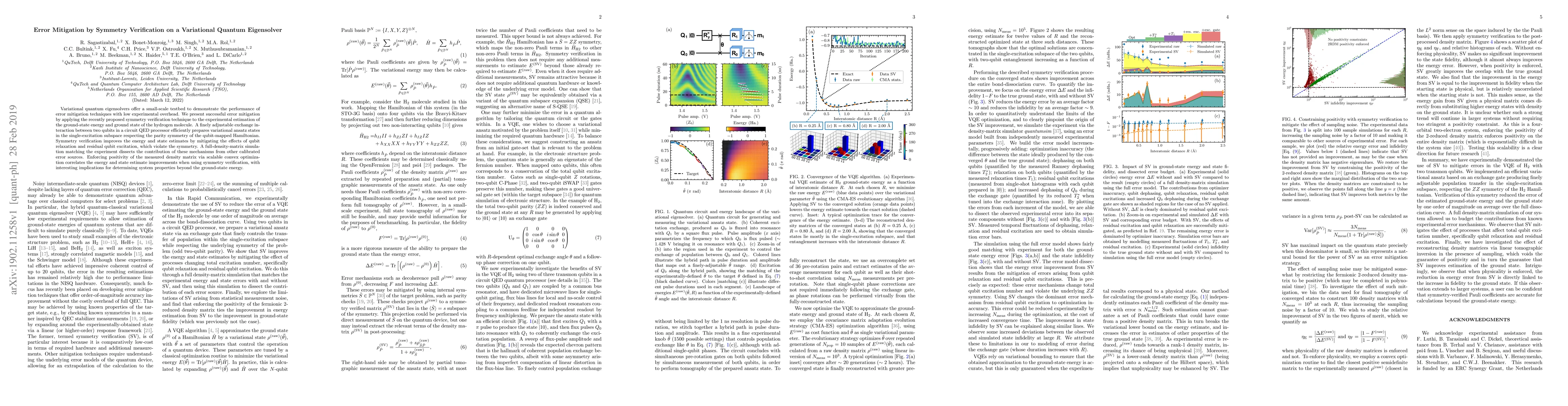 This paper demonstrates error mitigation in variational quantum eigensolvers using symmetry verification techniques to improve estimates of the ground-state energy and state of the hydrogen molecule. The method successfully mitigates qubit relaxation and residual excitation effects, enhancing accuracy through scalable convex optimization.