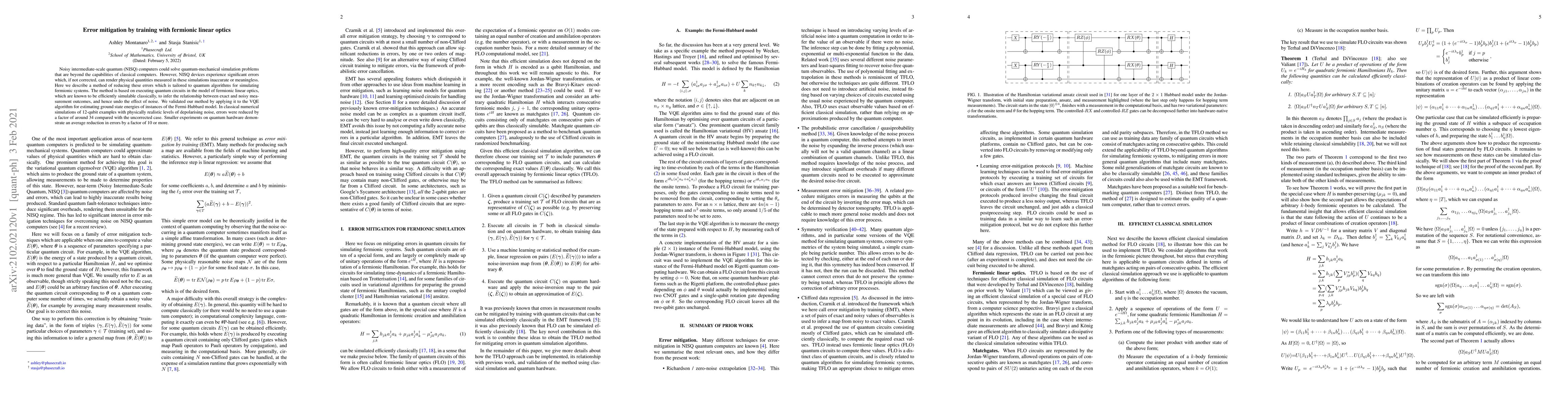 This paper proposes an error mitigation technique for noisy intermediate-scale quantum (NISQ) computers by training quantum circuits in fermionic linear optics to correct errors in quantum simulations of fermionic systems. The method effectively reduces errors by a factor of 34 in classical simulations and by a factor of 10 or more in smaller quantum hardware experiments.