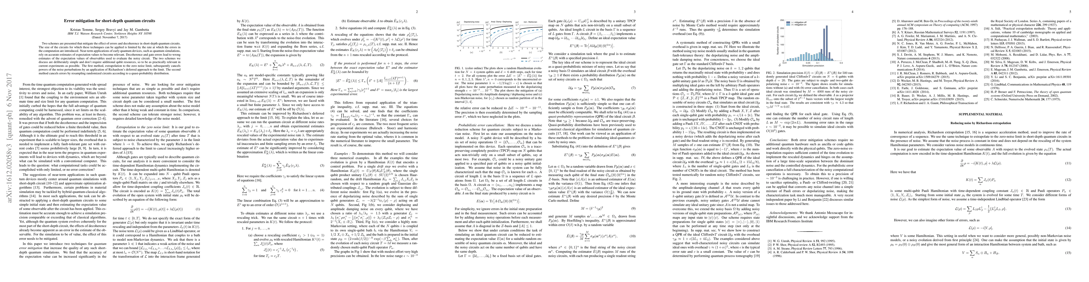 The paper presents two error mitigation schemes for short-depth quantum circuits, focusing on practical relevance by not requiring additional qubit resources. The first method, extrapolation to the zero noise limit, uses Richardson's deferred approach to cancel noise perturbations. The second method involves resampling randomized circuits according to a quasi-probability distribution to cancel errors.