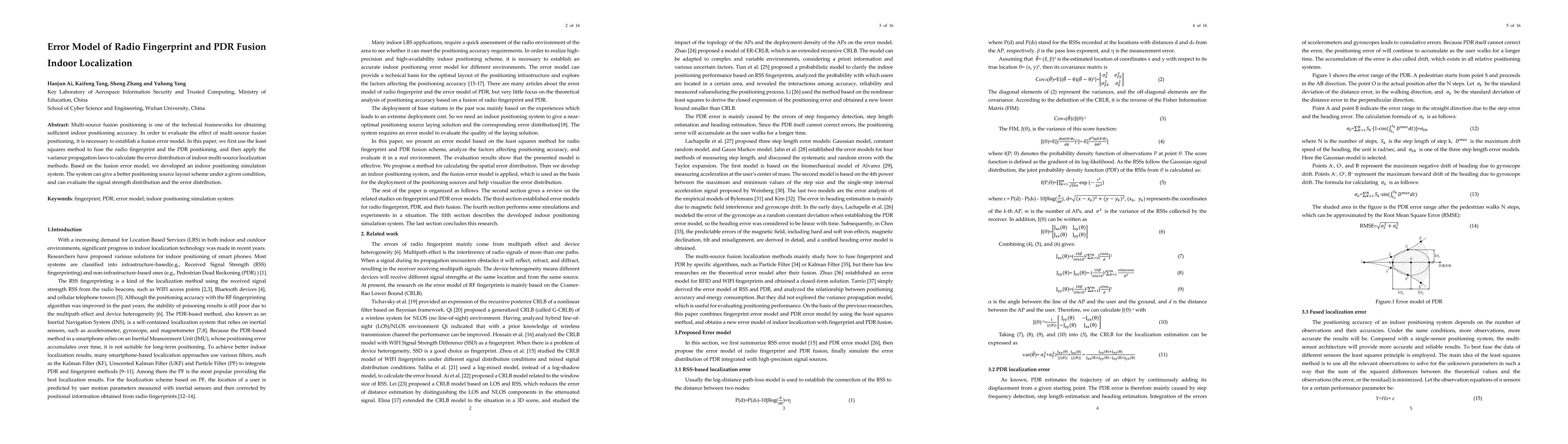 This paper develops a fusion error model for combining radio fingerprint and PDR (pedestrian dead reckoning) for indoor localization, using least squares fusion and variance propagation. The model enables the simulation of indoor positioning systems to optimize source layout and assess signal strength and error distribution.