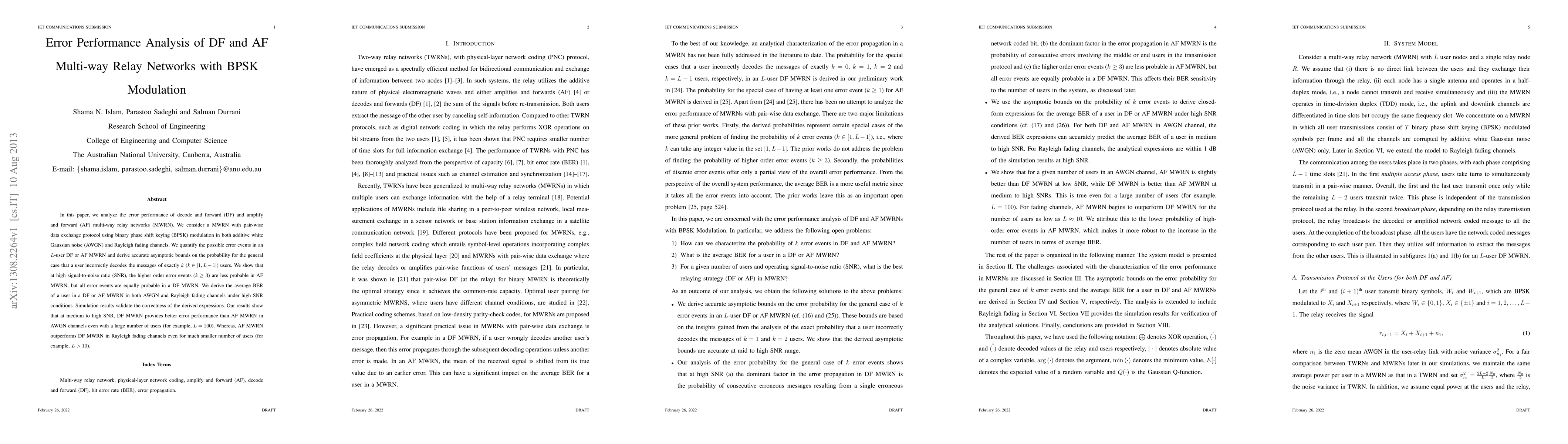 This paper analyzes the error performance of DF and AF multi-way relay networks using BPSK modulation, comparing their performance in AWGN and Rayleigh fading channels. It finds that DF MWRN offers better error performance in AWGN channels, while AF MWRN performs better in Rayleigh fading channels, especially with fewer users.