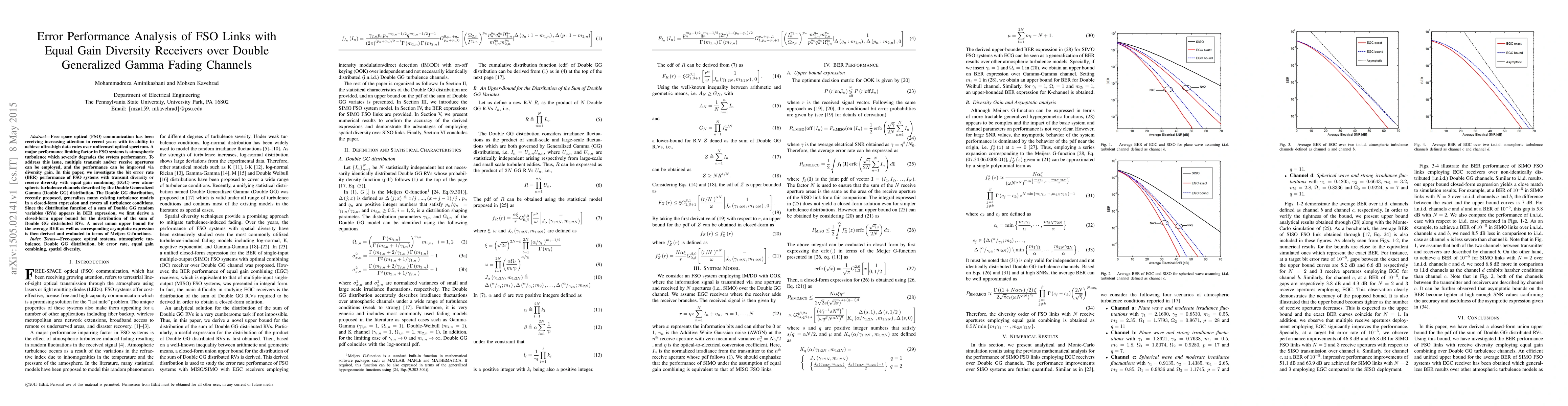This work is novel as it generalizes BER results over other atmospheric turbulence models as special cases and provides an efficient and unified upper bound for the average BER of SIMO FSO systems with EGC receivers over Double GG turbulence channels. Additionally, the asymptotic performance analysis offers insights into the diversity gains of SIMO FSO systems under high SNR conditions.