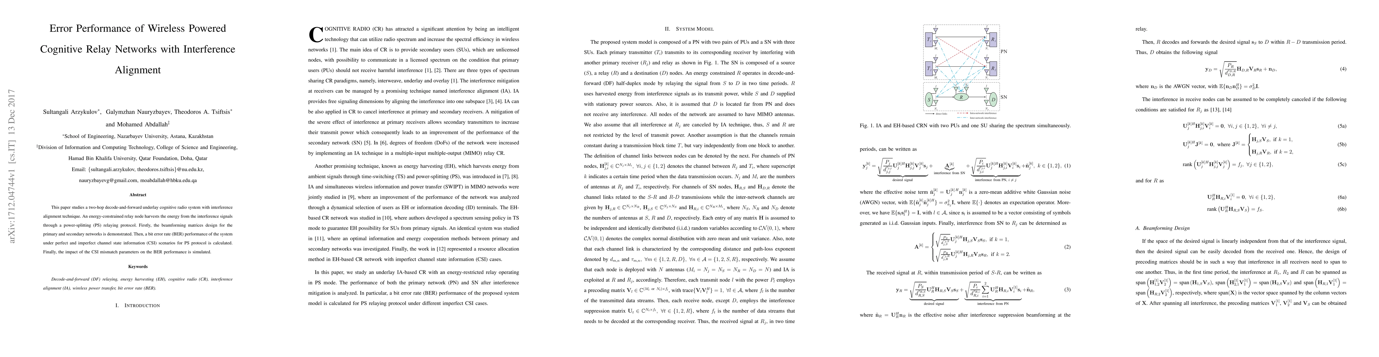 This paper investigates a two-hop cognitive relay system using decode-and-forward with interference alignment, where an energy-constrained relay harvests energy via a power-splitting protocol. It analyzes the bit error rate performance under both perfect and imperfect channel state information scenarios.