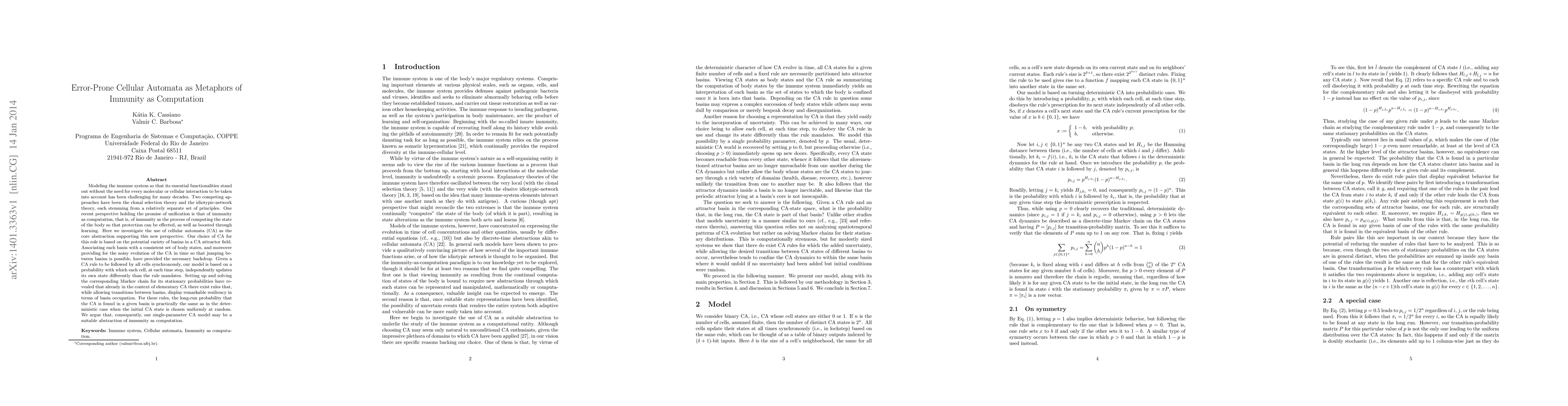 Modeling the immune system so that its essential functionalities stand out without the need for every molecular or cellular interaction to be taken into account has been challenging for many decades. Two competing approaches have been the clonal selection theory and the idiotypic-network theory, each stemming from a relatively separate set of principles. One recent perspective holding the promise of unification is that of immunity as computation, that is, of immunity as the process of computing the state of the body so that protection can be effected, as well as boosted through learning. Here we investigate the use of cellular automata (CA) as the core abstraction supporting this new perspective. Our choice of CA for this role is based on the potential variety of basins in a CA attractor field. Associating each basin with a consistent set of body states, and moreover providing for the noisy evolution of the CA in time so that jumping between basins is possible, have provided the necessary backdrop. Given a CA rule to be followed by all cells synchronously, our model is based on a probability with which each cell, at each time step, independently updates its own state differently than the rule mandates. Setting up and solving the corresponding Markov chain for its stationary probabilities have revealed that already in the context of elementary CA there exist rules that, while allowing transitions between basins, display remarkable resiliency in terms of basin occupation. For these rules, the long-run probability that the CA is found in a given basin is practically the same as in the deterministic case when the initial CA state is chosen uniformly at random. We argue that, consequently, our single-parameter CA model may be a suitable abstraction of immunity as computation.