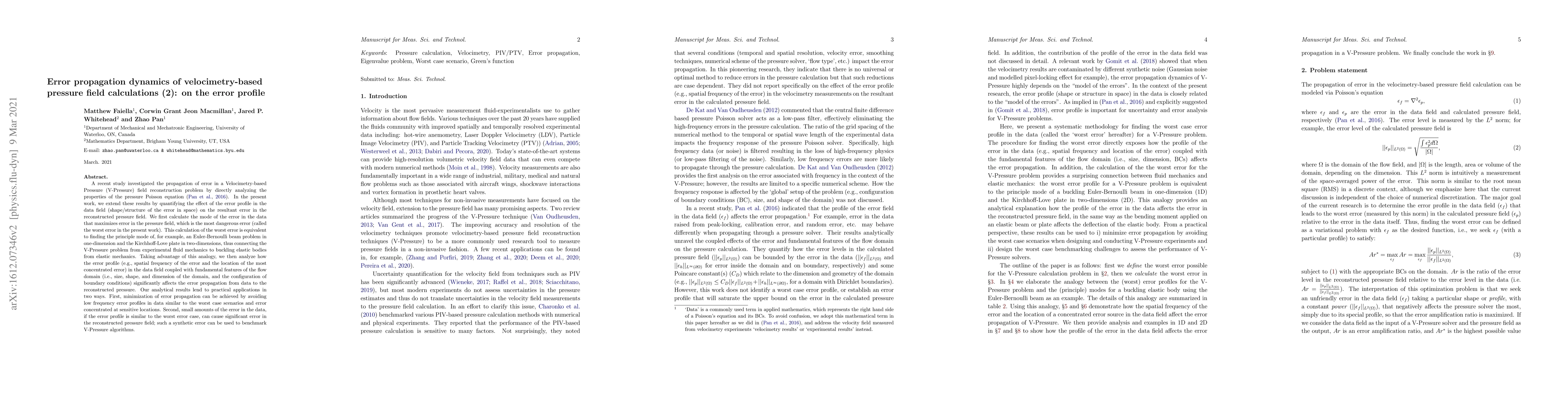 A recent study investigated the propagation of error in a Velocimetry-based Pressure (V-Pressure) field reconstruction problem by directly analyzing the properties of the pressure Poisson equation (Pan et al., 2016). In the present work, we extend these results by quantifying the effect of the error profile in the data field (shape/structure of the error in space) on the resultant error in the reconstructed pressure field. We first calculate the mode of the error in the data that maximizes error in the pressure field, which is the most dangerous error (called the worst error in the present work). This calculation of the worst error is equivalent to finding the principle mode of, for example, an Euler-Bernoulli beam problem in one-dimension and the Kirchhoff-Love plate in two-dimensions, thus connecting the V-Pressure problem from experimental fluid mechanics to buckling elastic bodies from elastic mechanics. Taking advantage of this analogy, we then analyze how the error profile (e.g., spatial frequency of the error and the location of the most concentrated error) in the data field coupled with fundamental features of the flow domain (i.e., size, shape, and dimension of the domain, and the configuration of boundary conditions) significantly affects the error propagation from data to the reconstructed pressure. Our analytical results lend to practical applications in two ways. First, minimization of error propagation can be achieved by avoiding low-frequency error profiles in data similar to the worst case scenarios and error concentrated at sensitive locations. Second, small amounts of the error in the data, if the error profile is similar to the worst error case, can cause significant error in the reconstructed pressure field; such a synthetic error can be used to benchmark V-Pressure algorithms.