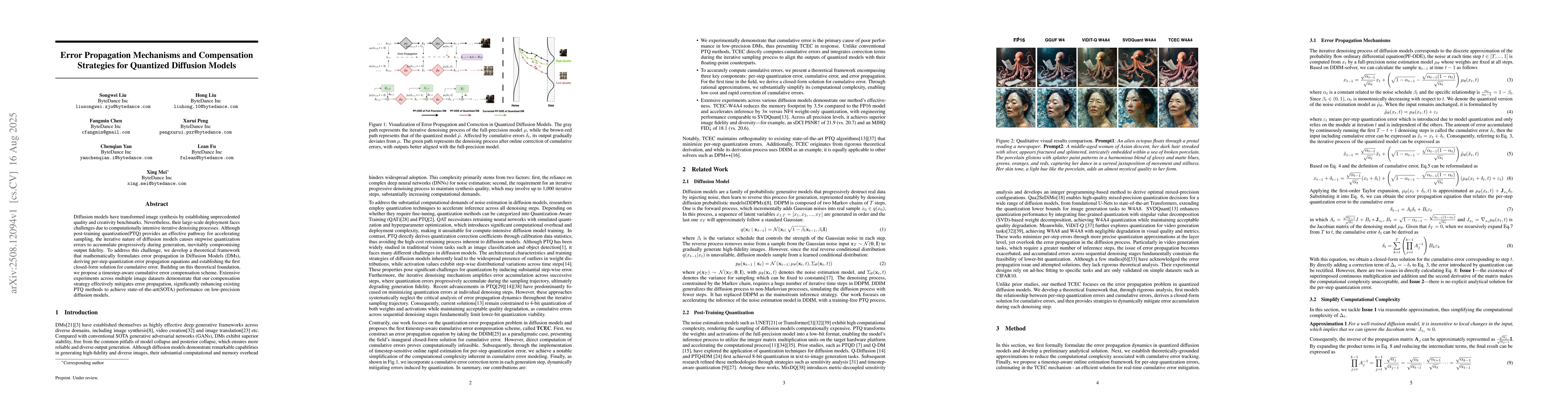 Diffusion models have transformed image synthesis by establishing unprecedented quality and creativity benchmarks. Nevertheless, their large-scale deployment faces challenges due to computationally intensive iterative denoising processes. Although post-training quantization(PTQ) provides an effective pathway for accelerating sampling, the iterative nature of diffusion models causes stepwise quantization errors to accumulate progressively during generation, inevitably compromising output fidelity. To address this challenge, we develop a theoretical framework that mathematically formulates error propagation in Diffusion Models (DMs), deriving per-step quantization error propagation equations and establishing the first closed-form solution for cumulative error. Building on this theoretical foundation, we propose a timestep-aware cumulative error compensation scheme. Extensive experiments across multiple image datasets demonstrate that our compensation strategy effectively mitigates error propagation, significantly enhancing existing PTQ methods to achieve state-of-the-art(SOTA) performance on low-precision diffusion models.