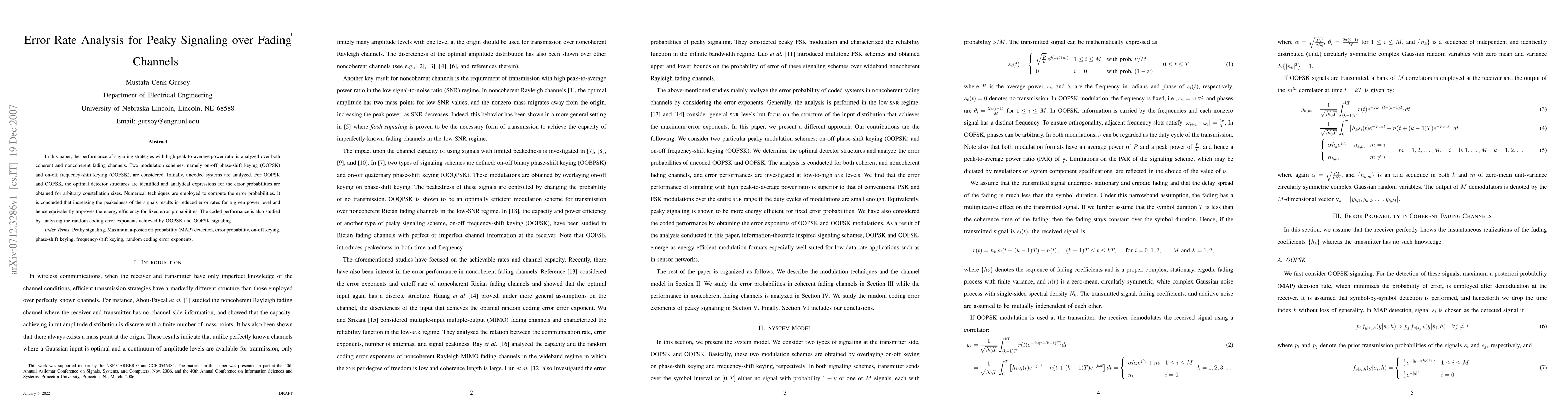 This paper analyzes the error rates of high peak-to-average power ratio signaling strategies, specifically OOPSK and OOFSK, over fading channels. It finds that increased signal peakedness reduces error rates, thereby improving energy efficiency, and examines the coded performance through random coding error exponents.