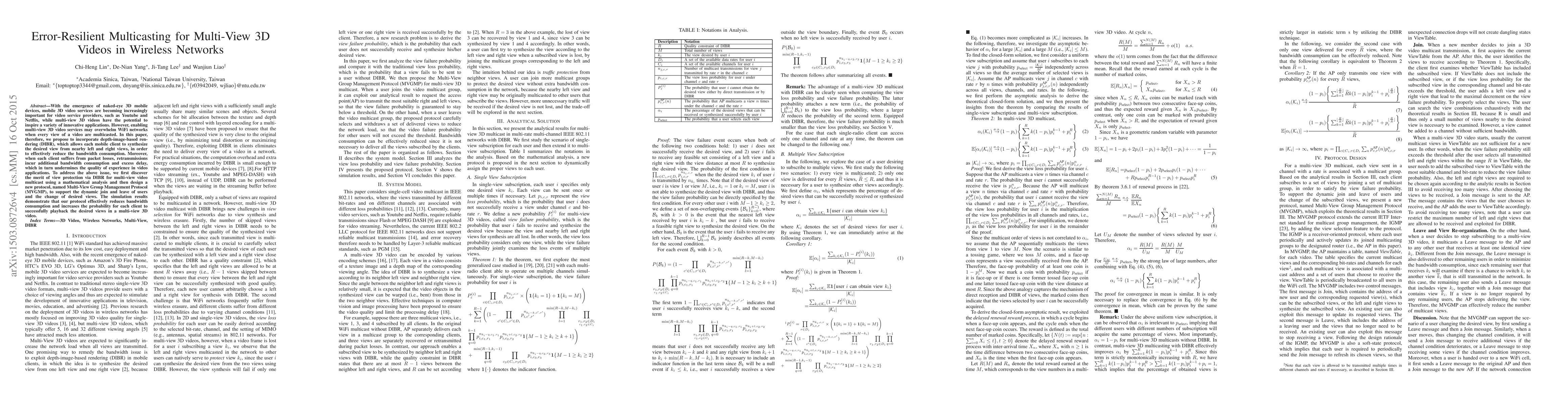 This paper proposes a method using depth-image-based rendering (DIBR) to reduce bandwidth for multi-view 3D video multicasting in wireless networks. It introduces the Multi-View Group Management Protocol (MVGMP) to dynamically manage users and views, significantly lowering bandwidth and improving playback success rates despite packet losses.