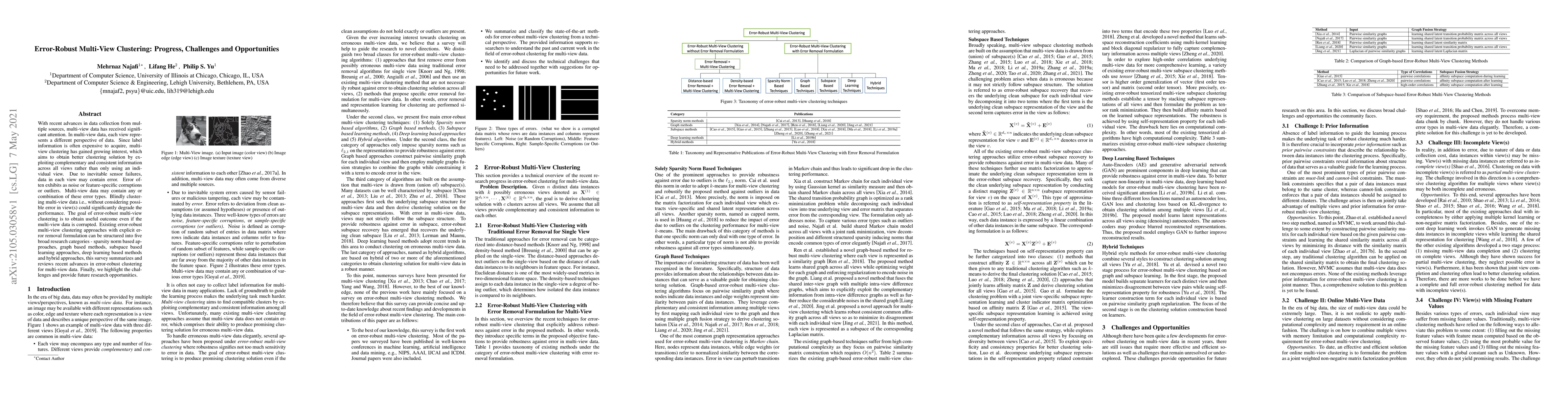 This paper surveys recent advances in error-robust multi-view clustering, emphasizing techniques to handle errors in data, which can degrade clustering performance. It categorizes existing methods and highlights challenges and future research opportunities in this evolving field.