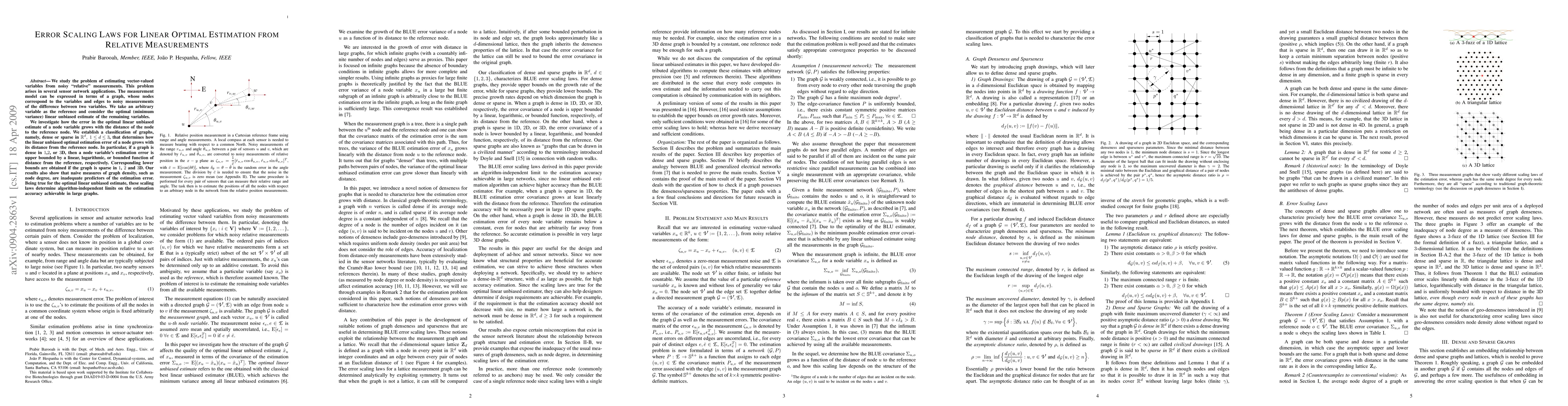 We study the problem of estimating vector-valued variables from noisy "relative" measurements. This problem arises in several sensor network applications. The measurement model can be expressed in terms of a graph, whose nodes correspond to the variables and edges to noisy measurements of the difference between two variables. We take an arbitrary variable as the reference and consider the optimal (minimum variance) linear unbiased estimate of the remaining variables. We investigate how the error in the optimal linear unbiased estimate of a node variable grows with the distance of the node to the reference node. We establish a classification of graphs, namely, dense or sparse in Rd,1<= d <=3, that determines how the linear unbiased optimal estimation error of a node grows with its distance from the reference node. In particular, if a graph is dense in 1,2, or 3D, then a node variable's estimation error is upper bounded by a linear, logarithmic, or bounded function of distance from the reference, respectively. Corresponding lower bounds are obtained if the graph is sparse in 1, 2 and 3D. Our results also show that naive measures of graph density, such as node degree, are inadequate predictors of the estimation error. Being true for the optimal linear unbiased estimate, these scaling laws determine algorithm-independent limits on the estimation accuracy achievable in large graphs.