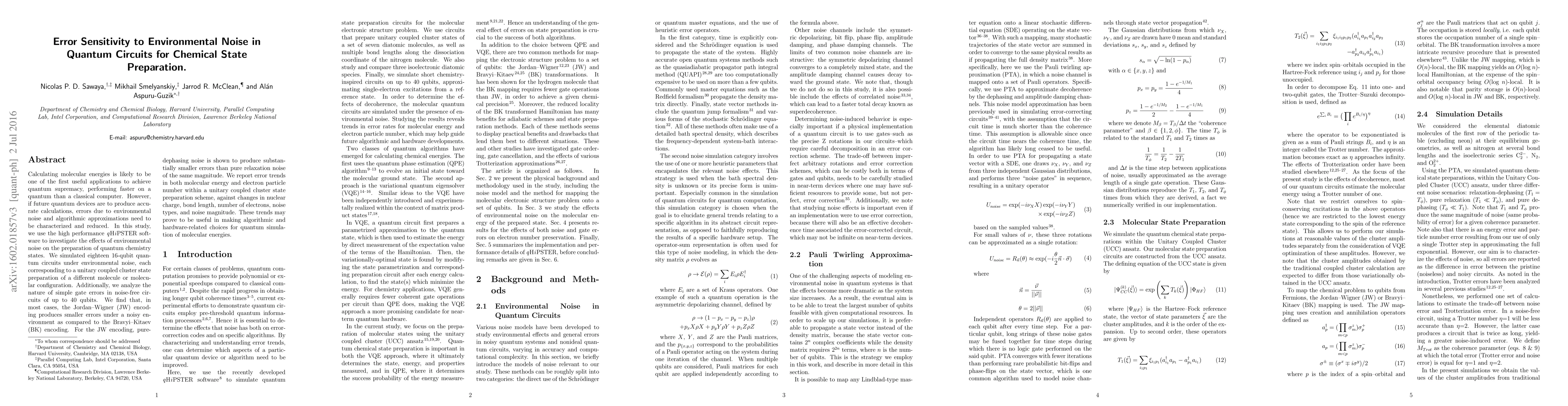 This study investigates the error sensitivity of quantum circuits for preparing quantum chemistry states under environmental noise, finding that the Jordan-Wigner encoding yields smaller errors compared to the Bravyi-Kitaev encoding. Pure-dephasing noise is shown to be less detrimental than pure relaxation noise.