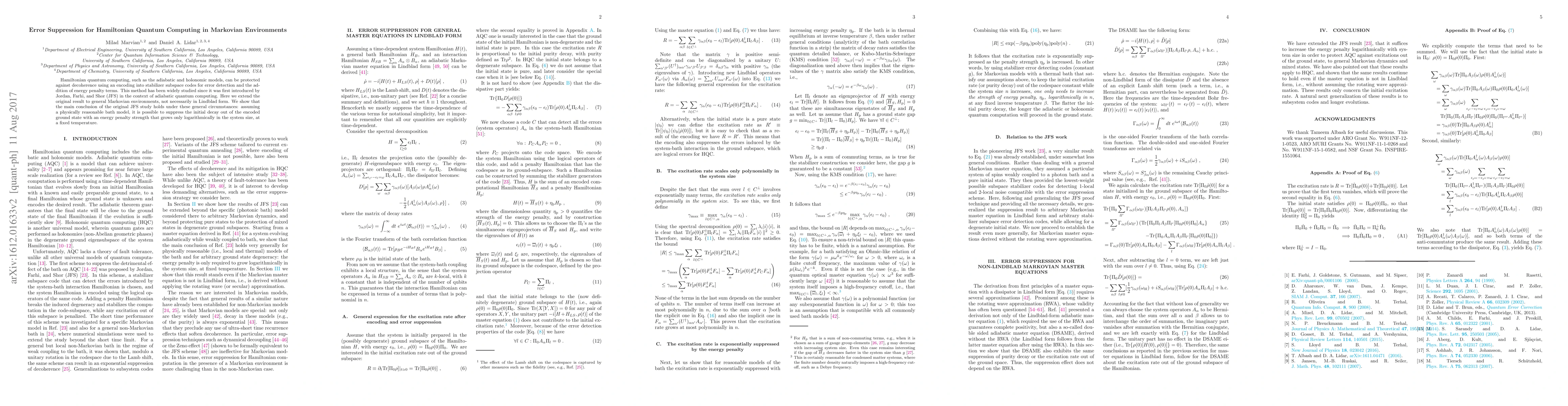 This paper extends stabilizer subspace codes for Hamiltonian quantum computing to general Markovian environments, demonstrating that error suppression can still be achieved with an energy penalty strength that grows logarithmically with system size, thus protecting against decoherence even outside the Lindblad form. The findings generalize the original JFS method for adiabatic quantum computing.