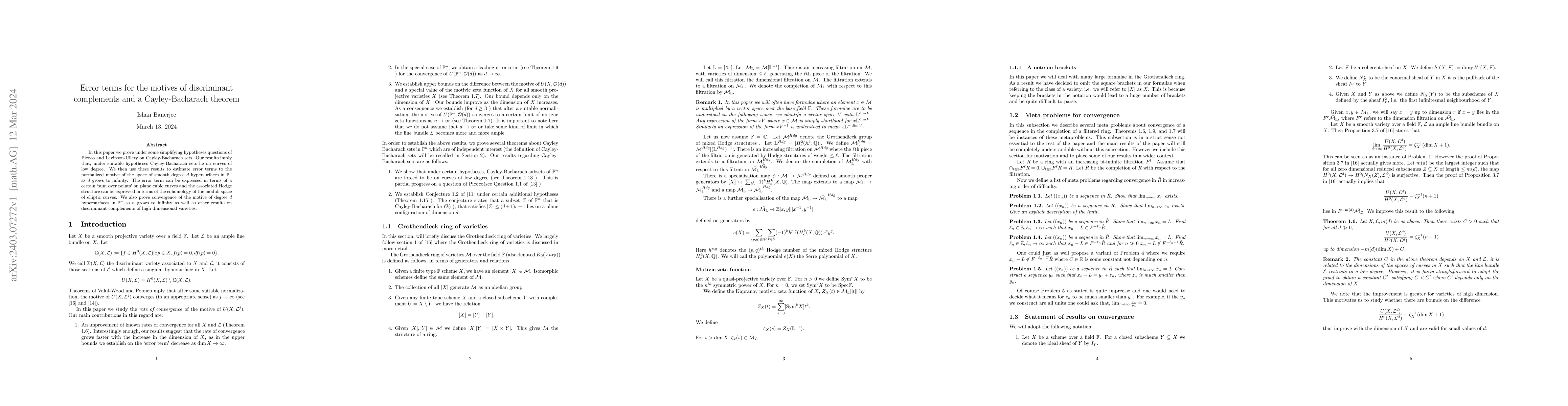 In this paper we prove under some simplifying hypotheses questions of Picoco and Levinson-Ullery on Cayley-Bacharach sets. Our results imply that, under suitable hypotheses Cayley-Bacharach sets lie on curves of low degree. We then use these results to estimate error terms to the normalized motive of the space of smooth degree $d$ hypersurfaces in $\mathbb{P}^n$as $d$ grows to infinity. The error term can be expressed in terms of a certain `sum over points' on plane cubic curves and the associated Hodge structure can be expressed in terms of the cohomology of the moduli space of elliptic curves. We also prove convergence of the motive of degree $d$ hypersurfaces in $\mathbb{P}^n$ as $n$ grows to infinity as well as other results on discriminant complements of high dimensional varieties.