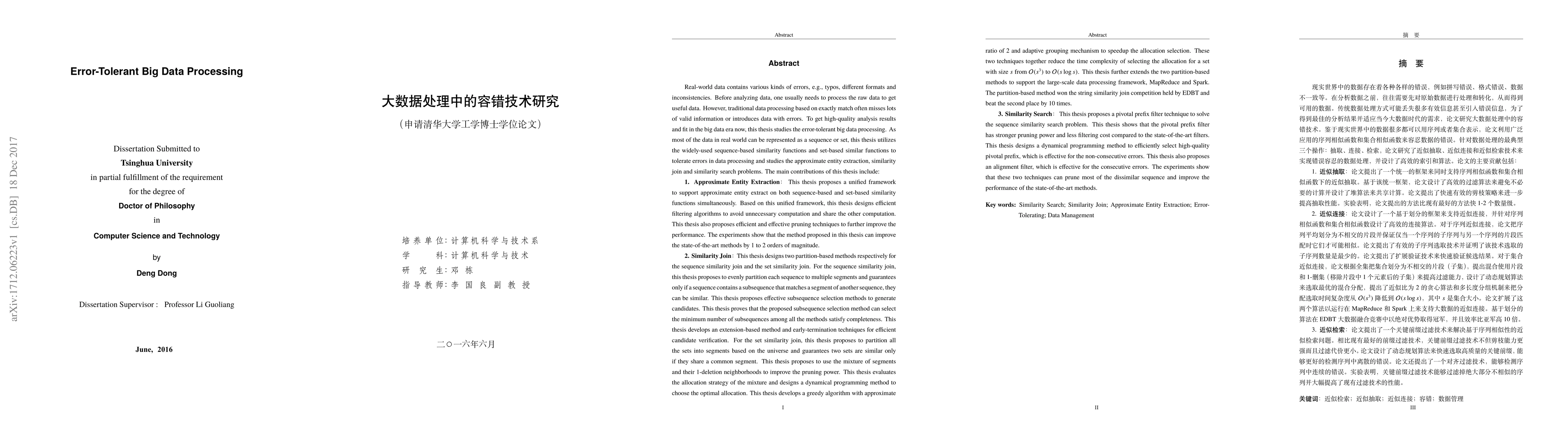 Real-world data contains various kinds of errors. Before analyzing data, one usually needs to process the raw data. However, traditional data processing based on exactly match often misses lots of valid information. To get high-quality analysis results and fit in the big data era, this thesis studies the error-tolerant big data processing. As most of the data in real world can be represented as a sequence or a set, this thesis utilizes the widely-used sequence-based and set-based similar functions to tolerate errors in data processing and studies the approximate entity extraction, similarity join and similarity search problems. The main contributions of this thesis include: 1. This thesis proposes a unified framework to support approximate entity extraction with both sequence-based and set-based similarity functions simultaneously. The experiments show that the unified framework can improve the state-of-the-art methods by 1 to 2 orders of magnitude. 2. This thesis designs two methods respectively for the sequence and the set similarity joins. For the sequence similarity join, this thesis proposes to evenly partition the sequences to segments. It is guaranteed that two sequences are similar only if one sequence has a subsequence identical to a segment of another sequence. For the set similarity join, this thesis proposes to partition all the sets into segments based on the universe. This thesis further extends the two partition-based methods to support the large-scale data processing framework, Map-Reduce and Spark. The partition-based method won the string similarity join competition held by EDBT and beat the second place by 10 times. 3. This thesis proposes a pivotal prefix filter technique to solve the sequence similarity search problem. This thesis shows that the pivotal prefix filter has stronger pruning power and less filtering cost compared to the state-of-the-art filters.