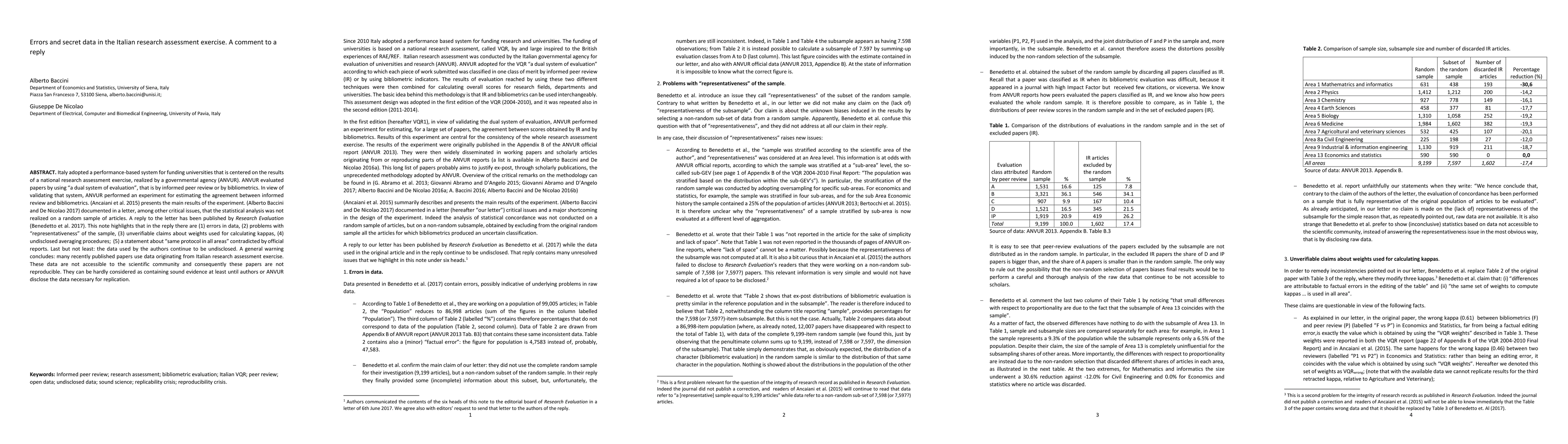 Italy adopted a performance-based system for funding universities that is centered on the results of a national research assessment exercise, realized by a governmental agency (ANVUR). ANVUR evaluated papers by using 'a dual system of evaluation', that is by informed peer review or by bibliometrics. In view of validating that system, ANVUR performed an experiment for estimating the agreement between informed review and bibliometrics. Ancaiani et al. (2015) presents the main results of the experiment. Baccini and De Nicolao (2017) documented in a letter, among other critical issues, that the statistical analysis was not realized on a random sample of articles. A reply to the letter has been published by Research Evaluation (Benedetto et al. 2017). This note highlights that in the reply there are (1) errors in data, (2) problems with 'representativeness' of the sample, (3) unverifiable claims about weights used for calculating kappas, (4) undisclosed averaging procedures; (5) a statement about 'same protocol in all areas' contradicted by official reports. Last but not least: the data used by the authors continue to be undisclosed. A general warning concludes: many recently published papers use data originating from Italian research assessment exercise. These data are not accessible to the scientific community and consequently these papers are not reproducible. They can be hardly considered as containing sound evidence at least until authors or ANVUR disclose the data necessary for replication.