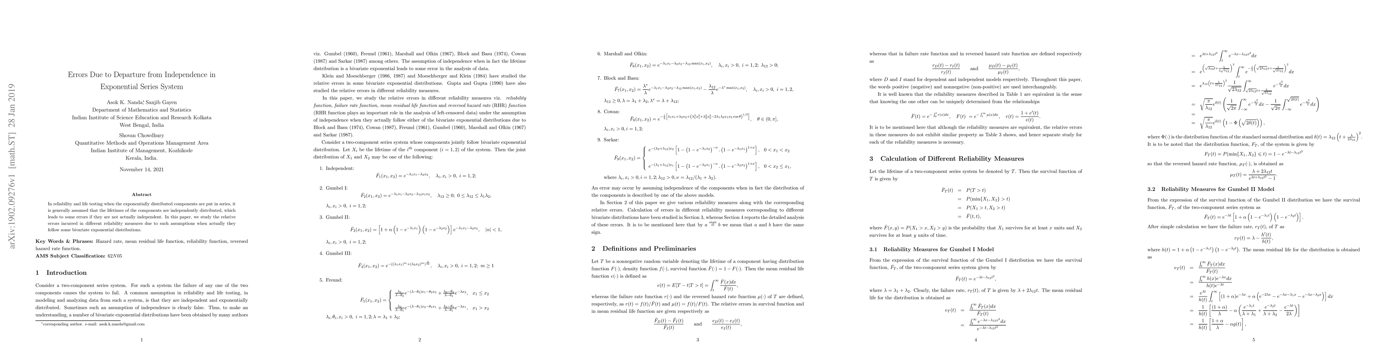 In reliability and life testing when the exponentially distributed components are put in series, it is generally assumed that the lifetimes of the components are independently distributed, which leads to some errors if they are not actually independent. In this paper, we study the relative errors incurred in different reliability measures due to such assumptions when actually they follow some bivariate exponential distributions.