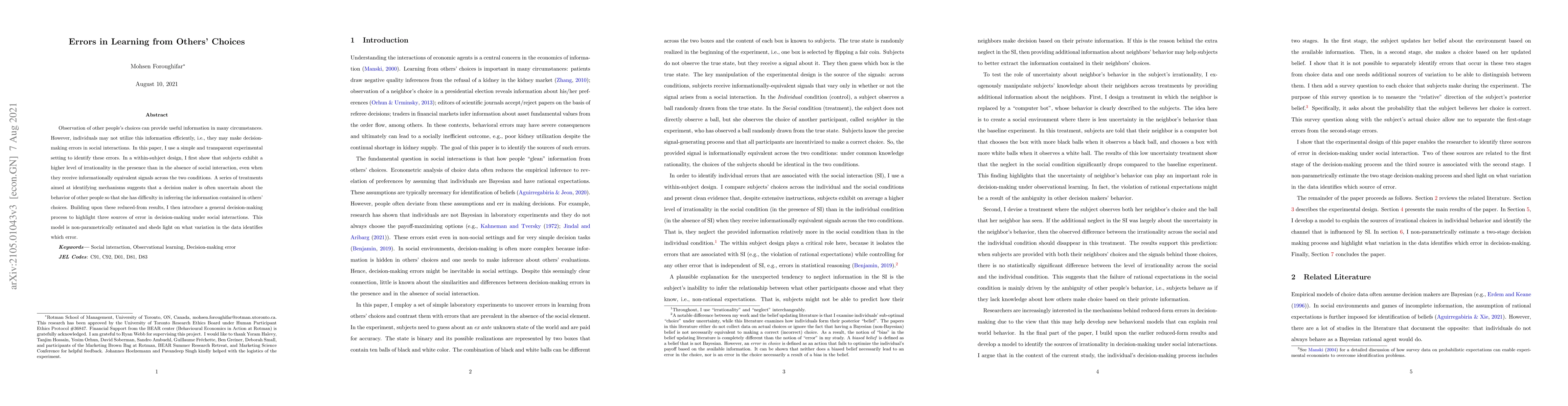 Observation of other people's choices can provide useful information in many circumstances. However, individuals may not utilize this information efficiently, i.e., they may make decision-making errors in social interactions. In this paper, I use a simple and transparent experimental setting to identify these errors. In a within-subject design, I first show that subjects exhibit a higher level of irrationality in the presence than in the absence of social interaction, even when they receive informationally equivalent signals across the two conditions. A series of treatments aimed at identifying mechanisms suggests that a decision maker is often uncertain about the behavior of other people so that she has difficulty in inferring the information contained in others' choices. Building upon these reduced-from results, I then introduce a general decision-making process to highlight three sources of error in decision-making under social interactions. This model is non-parametrically estimated and sheds light on what variation in the data identifies which error.