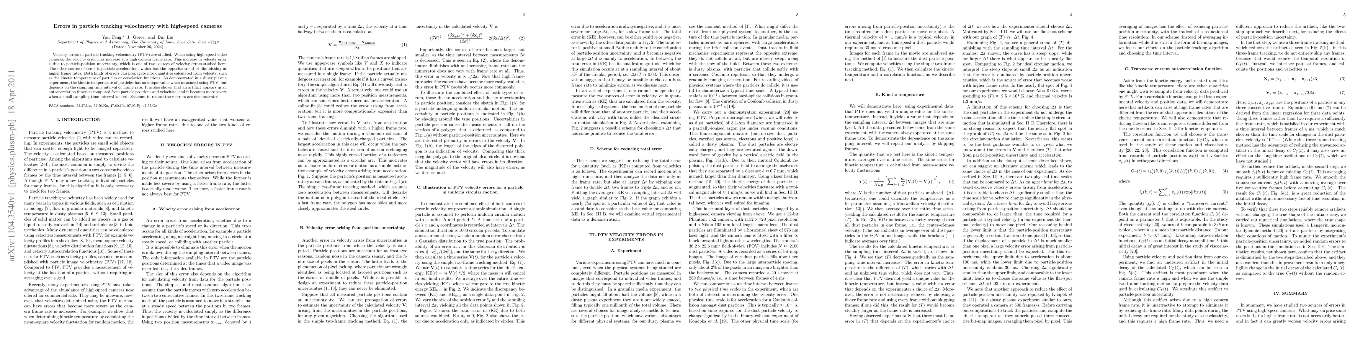 This paper investigates velocity errors in particle tracking velocimetry (PTV) using high-speed cameras, identifying particle-position uncertainty and particle acceleration as two main sources of error. It demonstrates that while particle-position uncertainty increases with higher frame rates, particle acceleration decreases, leading to complex effects on derived quantities like kinetic temperature and correlation functions.