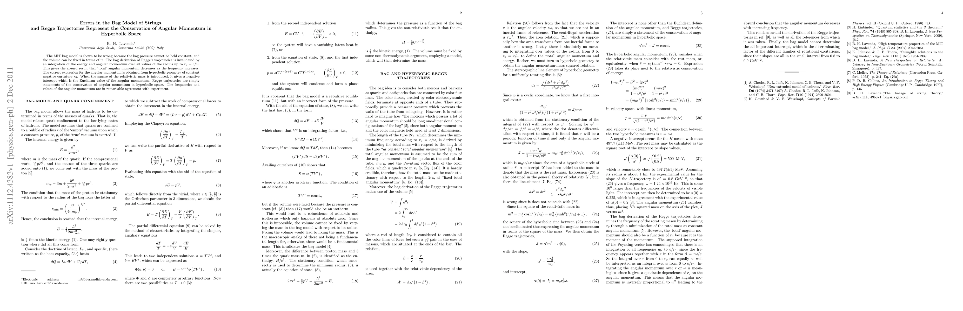 The MIT bag model is shown to be wrong because the bag pressure cannot be held constant, and the volume can be fixed in terms of it. The bag derivation of Regge's trajectories is invalidated by an integration of the energy and angular momentum over all values of the radius up to $r_0=c/\omega$. This gives the absurd result that "total" angular momentum decreases as the frequency increases. The correct expression for the angular momentum is obtained from hyperbolic geometry of constant negative curvature $r_0$. When the square of the relativistic mass is introduced, it gives a negative intercept which is the Euclidean value of the angular momentum. Regge trajectories are simply statements of the conservation of angular momentum in hyperbolic space. The frequencies and values of the angular momentum are in remarkable agreement with experiment.