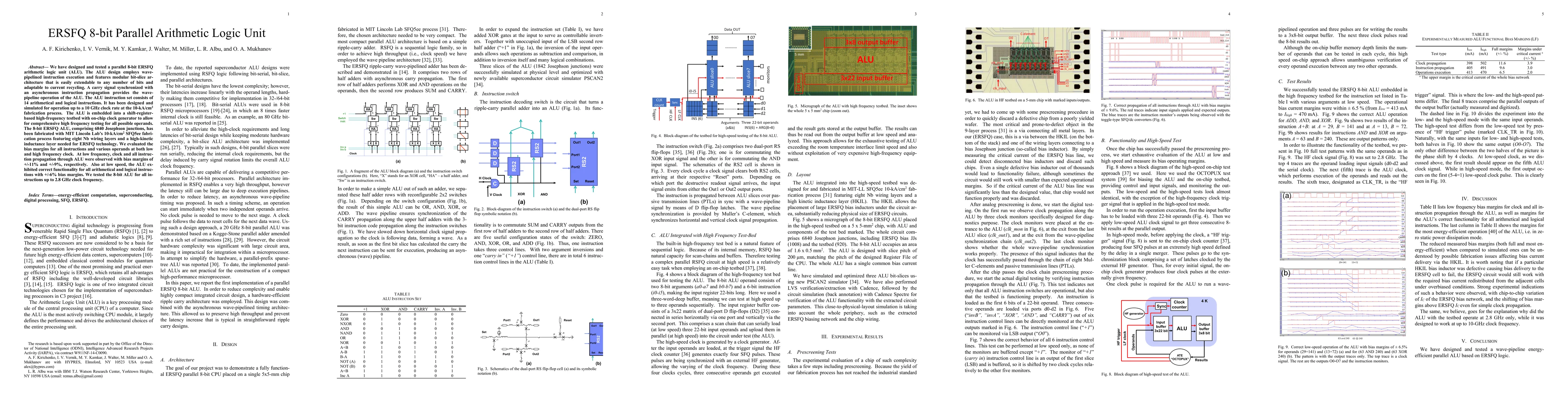 We have designed and tested a parallel 8-bit ERSFQ arithmetic logic unit (ALU). The ALU design employs wave-pipelined instruction execution and features modular bit-slice architecture that is easily extendable to any number of bits and adaptable to current recycling. A carry signal synchronized with an asynchronous instruction propagation provides the wave-pipeline operation of the ALU. The ALU instruction set consists of 14 arithmetical and logical instructions. It has been designed and simulated for operation up to a 10 GHz clock rate at the 10-kA/cm2 fabrication process. The ALU is embedded into a shift-register-based high-frequency testbed with on-chip clock generator to allow for comprehensive high frequency testing for all possible operands. The 8-bit ERSFQ ALU, comprising 6840 Josephson junctions, has been fabricated with MIT Lincoln Lab 10-kA/cm2 SFQ5ee fabrication process featuring eight Nb wiring layers and a high-kinetic inductance layer needed for ERSFQ technology. We evaluated the bias margins for all instructions and various operands at both low and high frequency clock. At low frequency, clock and all instruction propagation through ALU were observed with bias margins of +/-11% and +/-9%, respectively. Also at low speed, the ALU exhibited correct functionality for all arithmetical and logical instructions with +/-6% bias margins. We tested the 8-bit ALU for all instructions up to 2.8 GHz clock frequency.