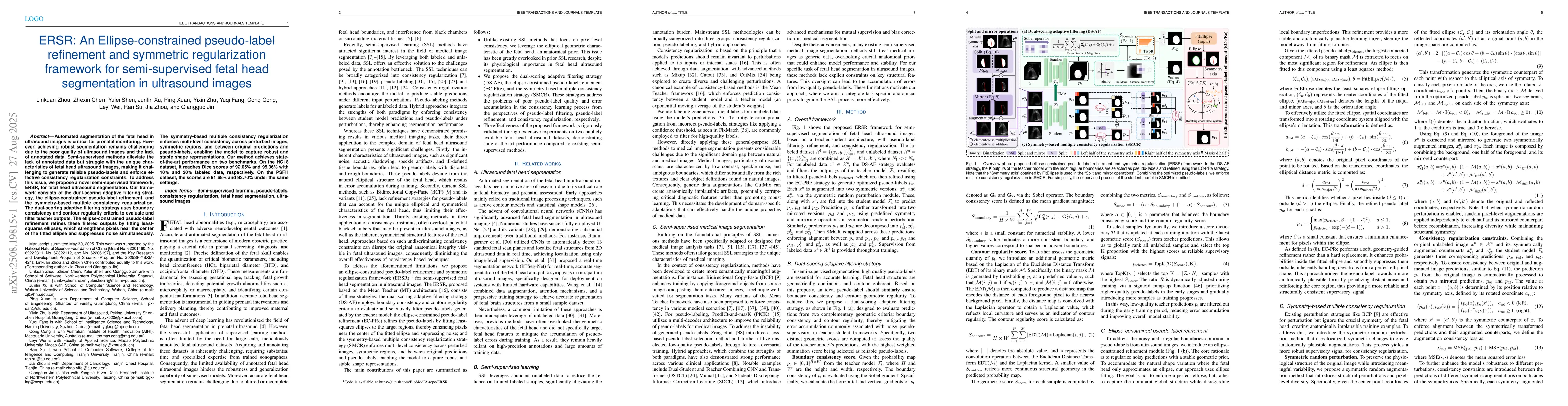 Automated segmentation of the fetal head in ultrasound images is critical for prenatal monitoring. However, achieving robust segmentation remains challenging due to the poor quality of ultrasound images and the lack of annotated data. Semi-supervised methods alleviate the lack of annotated data but struggle with the unique characteristics of fetal head ultrasound images, making it challenging to generate reliable pseudo-labels and enforce effective consistency regularization constraints. To address this issue, we propose a novel semi-supervised framework, ERSR, for fetal head ultrasound segmentation. Our framework consists of the dual-scoring adaptive filtering strategy, the ellipse-constrained pseudo-label refinement, and the symmetry-based multiple consistency regularization. The dual-scoring adaptive filtering strategy uses boundary consistency and contour regularity criteria to evaluate and filter teacher outputs. The ellipse-constrained pseudo-label refinement refines these filtered outputs by fitting least-squares ellipses, which strengthens pixels near the center of the fitted ellipse and suppresses noise simultaneously. The symmetry-based multiple consistency regularization enforces multi-level consistency across perturbed images, symmetric regions, and between original predictions and pseudo-labels, enabling the model to capture robust and stable shape representations. Our method achieves state-of-the-art performance on two benchmarks. On the HC18 dataset, it reaches Dice scores of 92.05% and 95.36% with 10% and 20% labeled data, respectively. On the PSFH dataset, the scores are 91.68% and 93.70% under the same settings.