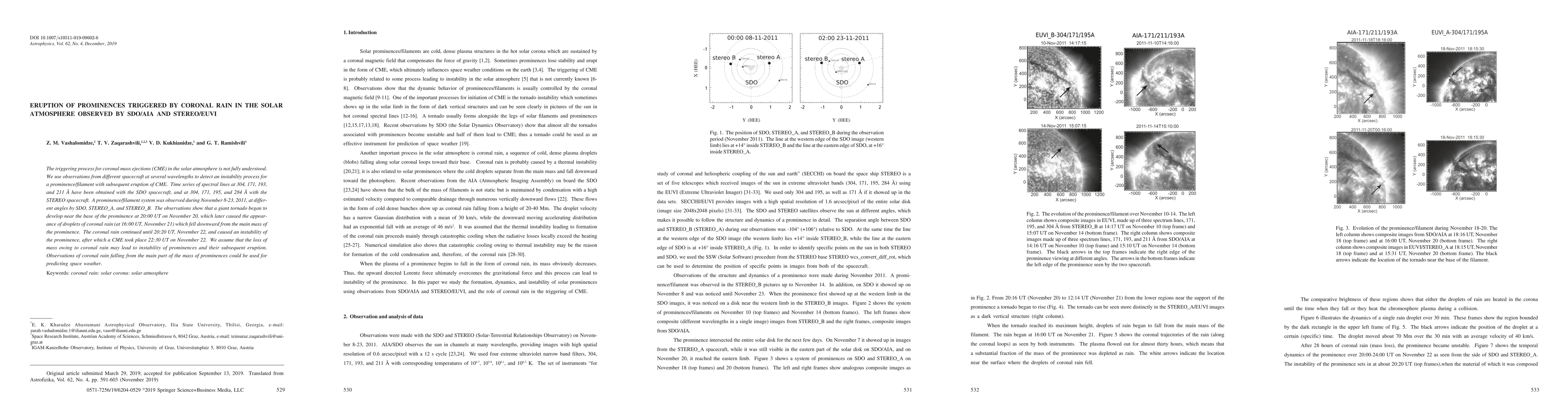 This study investigates the eruption of a solar prominence triggered by coronal rain, observed by SDO/AIA and STEREO/EUVI. The observations reveal that the loss of mass due to coronal rain caused instability and subsequent eruption of the prominence, suggesting a potential link to predicting space weather.