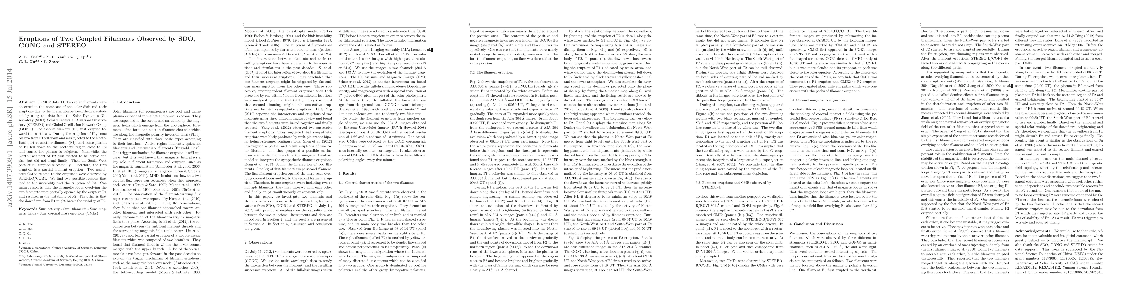 This study examines the interaction and eruptions of two coupled solar filaments observed on July 11, 2012, using data from SDO, STEREO, and GONG. The eastern filament's eruption caused plasma to interact with the western filament, leading to a partial eruption of the latter, influenced by the magnetic loop opening and downflows from the first filament.