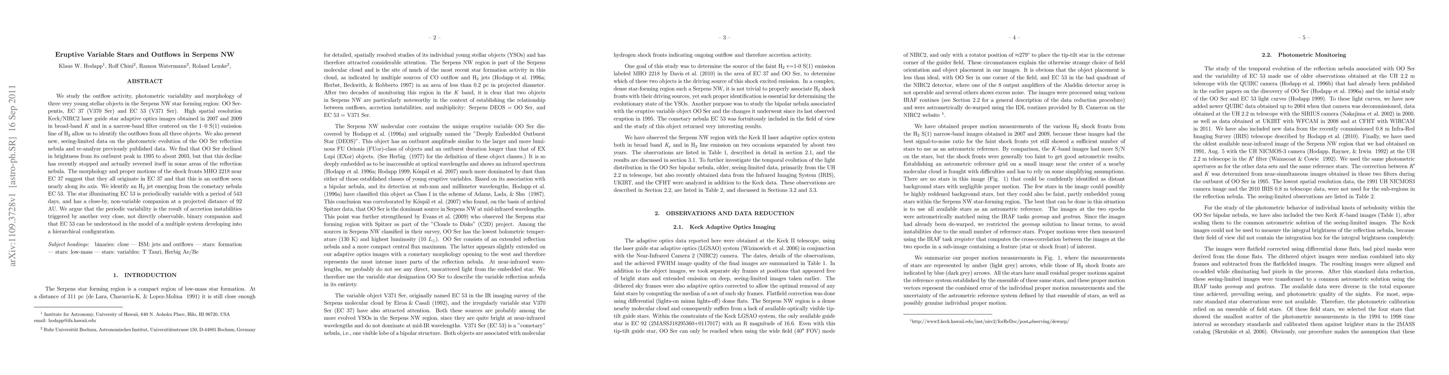 We study the outflow activity, photometric variability and morphology of three very young stellar objects in the Serpens NW star forming region: OO Serpentis, EC 37 (V370 Ser) and EC 53 (V371 Ser). High spatial resolution Keck/NIRC2 laser guide star adaptive optics images obtained in 2007 and 2009 in broad-band K and in a narrow-band filter centered on the 1-0 S(1) emission line of molecular hydrogen allow us to identify the outflows from all three objects. We also present new, seeing-limited data on the photometric evolution of the OO Ser reflection nebula and re-analyze previously published data. We find that OO Ser declined in brightness from its outburst peak in 1995 to about 2003, but that this decline has recently stopped and actually reversed itself in some areas of the reflection nebula. The morphology and proper motions of the shock fronts MHO 2218 near EC 37 suggest that they all originate in EC 37 and that this is an outflow seen nearly along its axis. We identify a molecular hydrogen jet emerging from the cometary nebula EC 53. The star illuminating EC 53 is periodically variable with a period of 543 days, and has a close-by, non-variable companion at a projected distance of 92 AU. We argue that the periodic variability is the result of accretion instabilities triggered by another very close, not directly observable, binary companion and that EC 53 can be understood in the model of a multiple system developing into a hierarchical configuration.