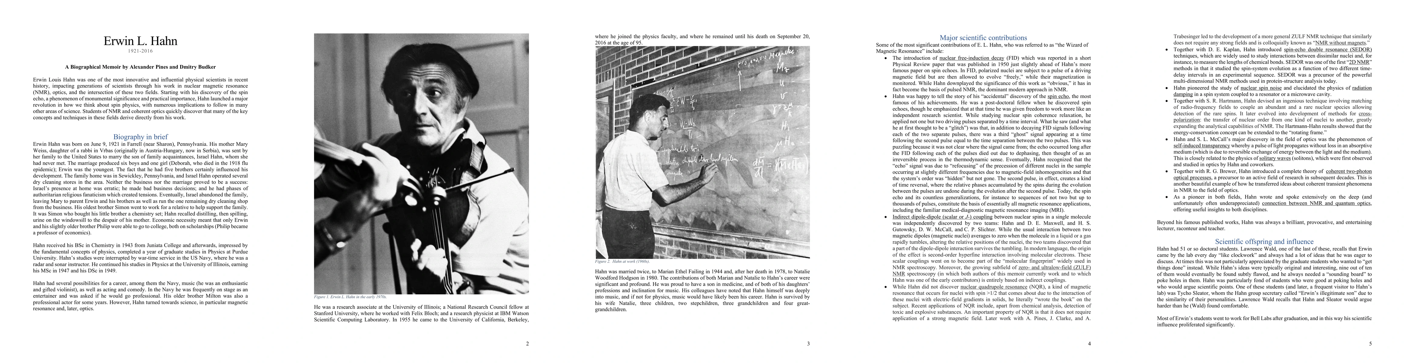 Erwin Louis Hahn was one of the most innovative and influential physical scientists in recent history, impacting generations of scientists through his work in nuclear magnetic resonance (NMR), optics, and the intersection of these two fields. Starting with his discovery of the spin echo, a phenomenon of monumental significance and practical importance, Hahn launched a major revolution in how we think about spin physics, with numerous implications to follow in many other areas of science. Students of NMR and coherent optics quickly discover that many of the key concepts and techniques in these fields derive directly from his work.